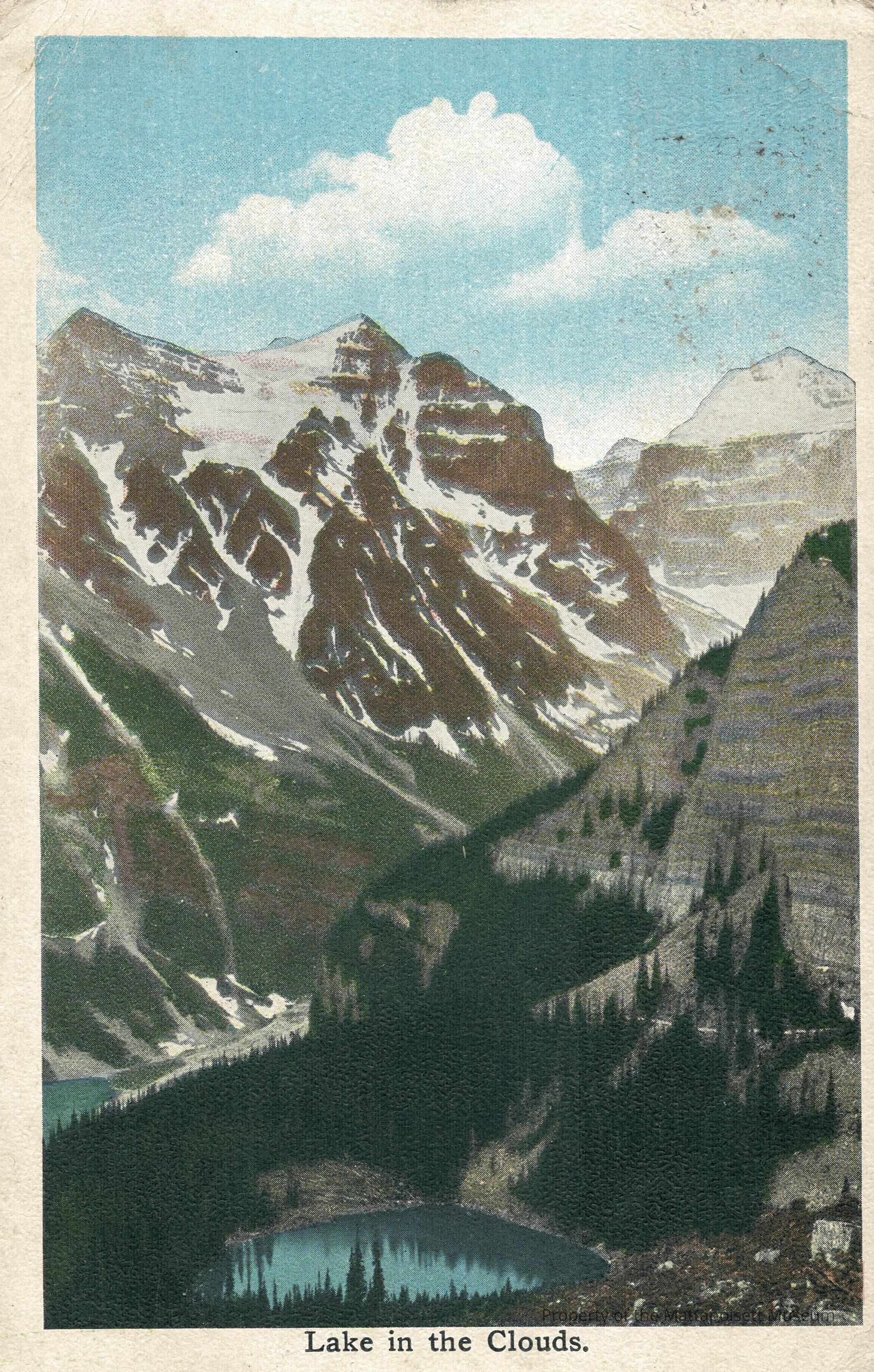 Hand-colored postcard showing Lake in the Clouds, along the line of the Canadian Pacific Ry. Handwritten note to Mrs. Olivia Purrington, Mattapoisett, Massachusetts, U.S.A. Postmarked from Chateau Lake Louise, Alberta, Canada on August 31, 1915.Collection