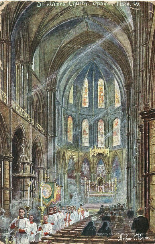 Hand-colored postcard showing St. James Church, Spanish Place, W., London, England. Handwritten note to Mrs. G. Purrington, Mattapoisett, Mass., U.S.A. Postmarked from London, W.G., date not legible.Collection
