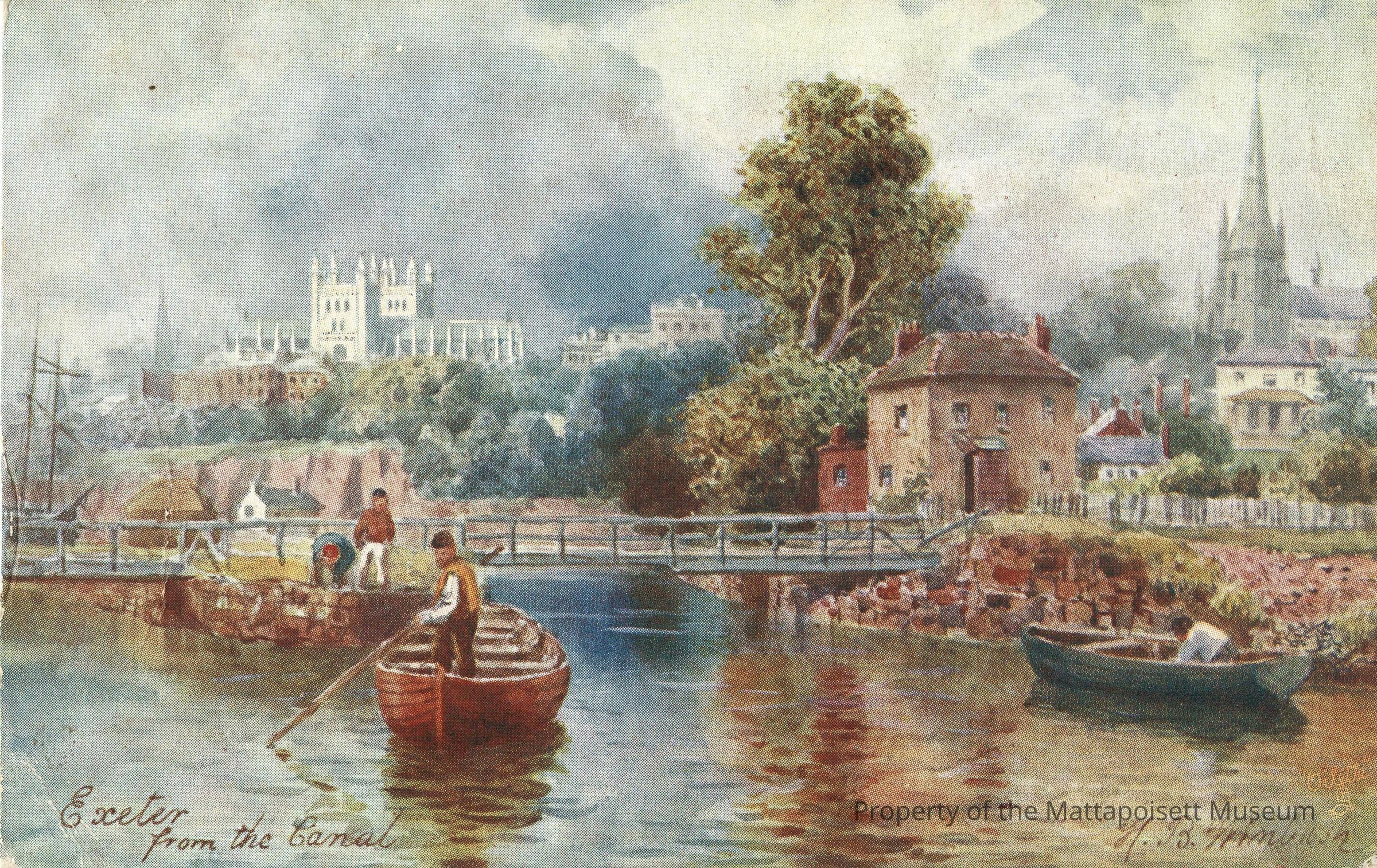 Hand-colored postcard showing Exeter from the Canal. Handwritten note to Mrs. G. Purrington, dated November 20, 1910. No postmark or stamp.Collection