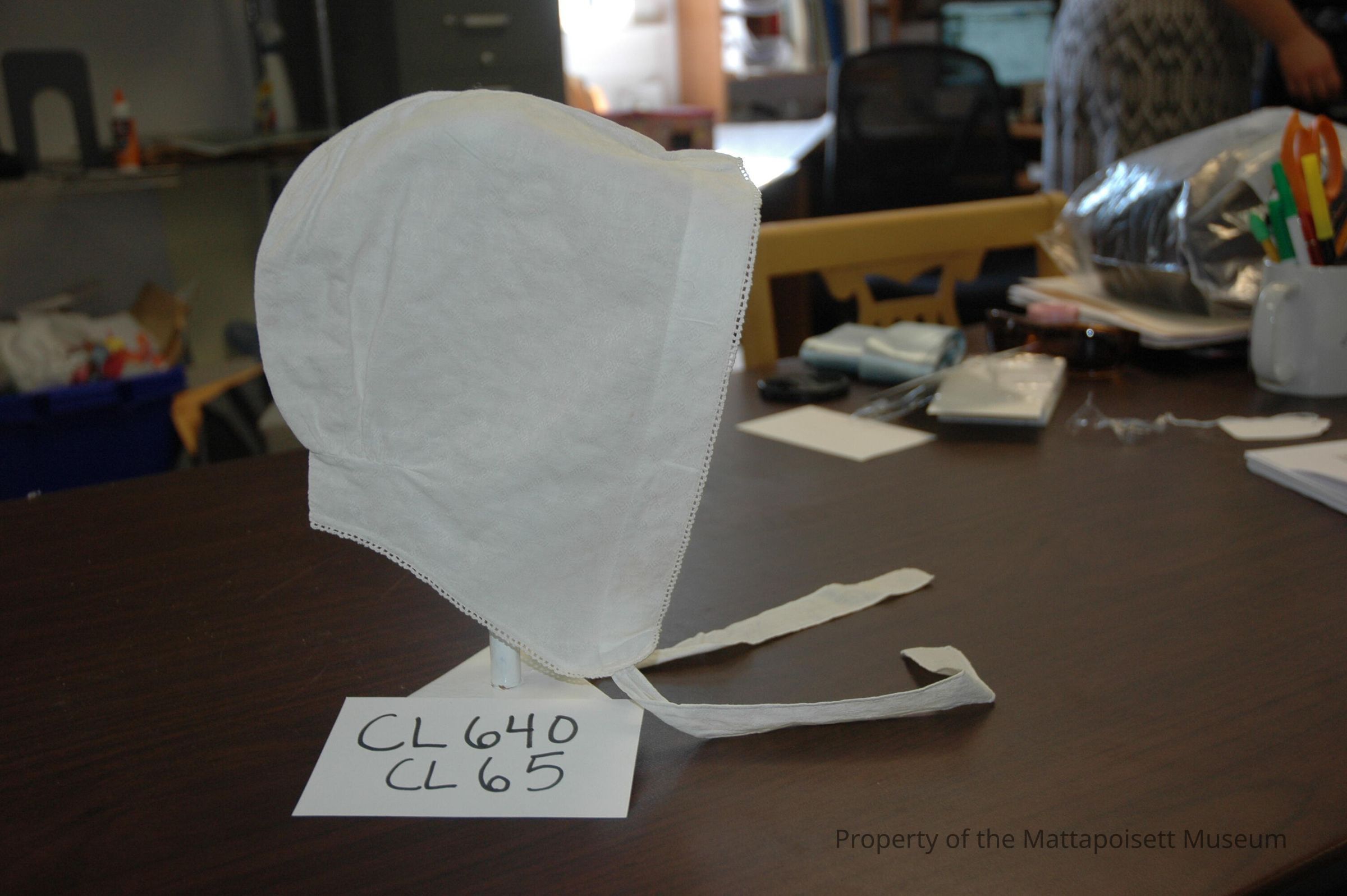 Muslin nightcap with pico edge.Collection