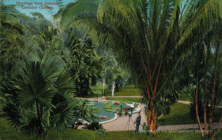 Hand-colored postcard showing Greetings from Jamaica, Castleton Gardens.Collection