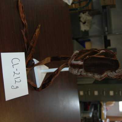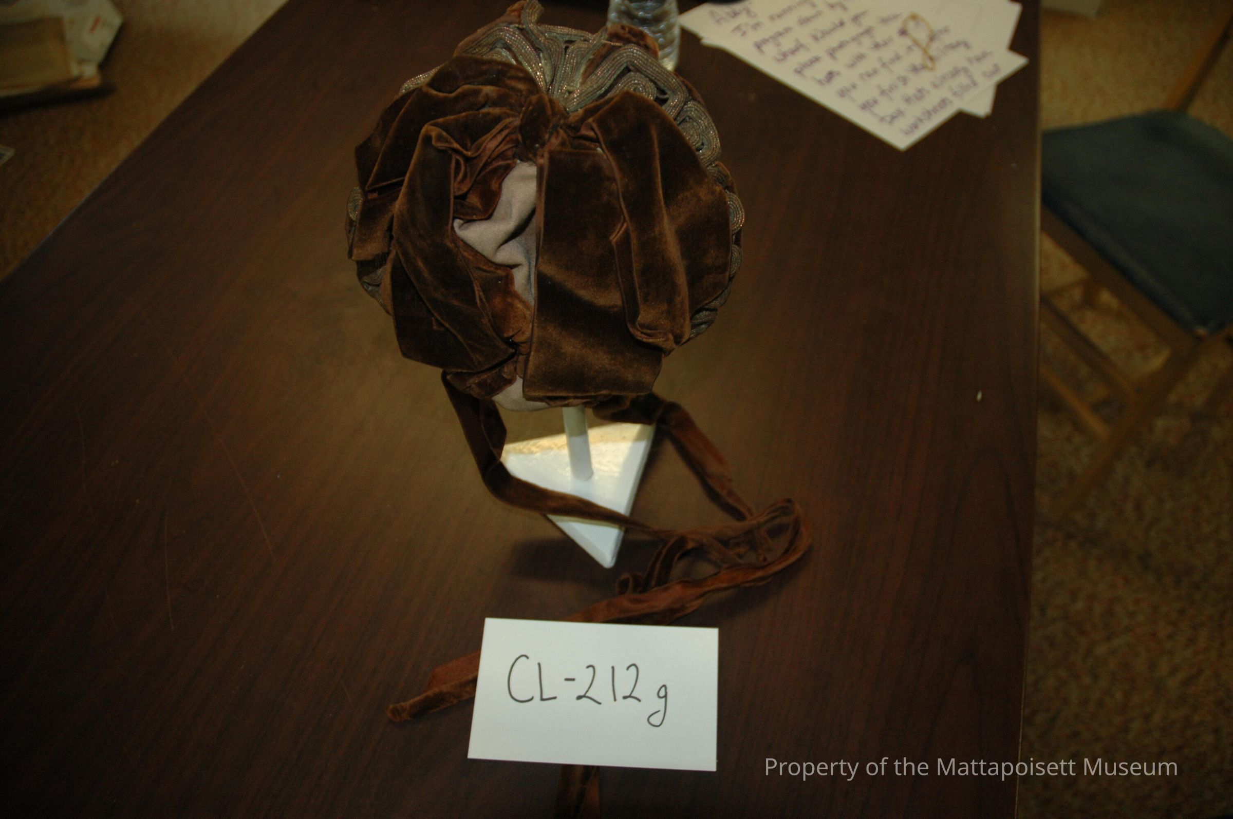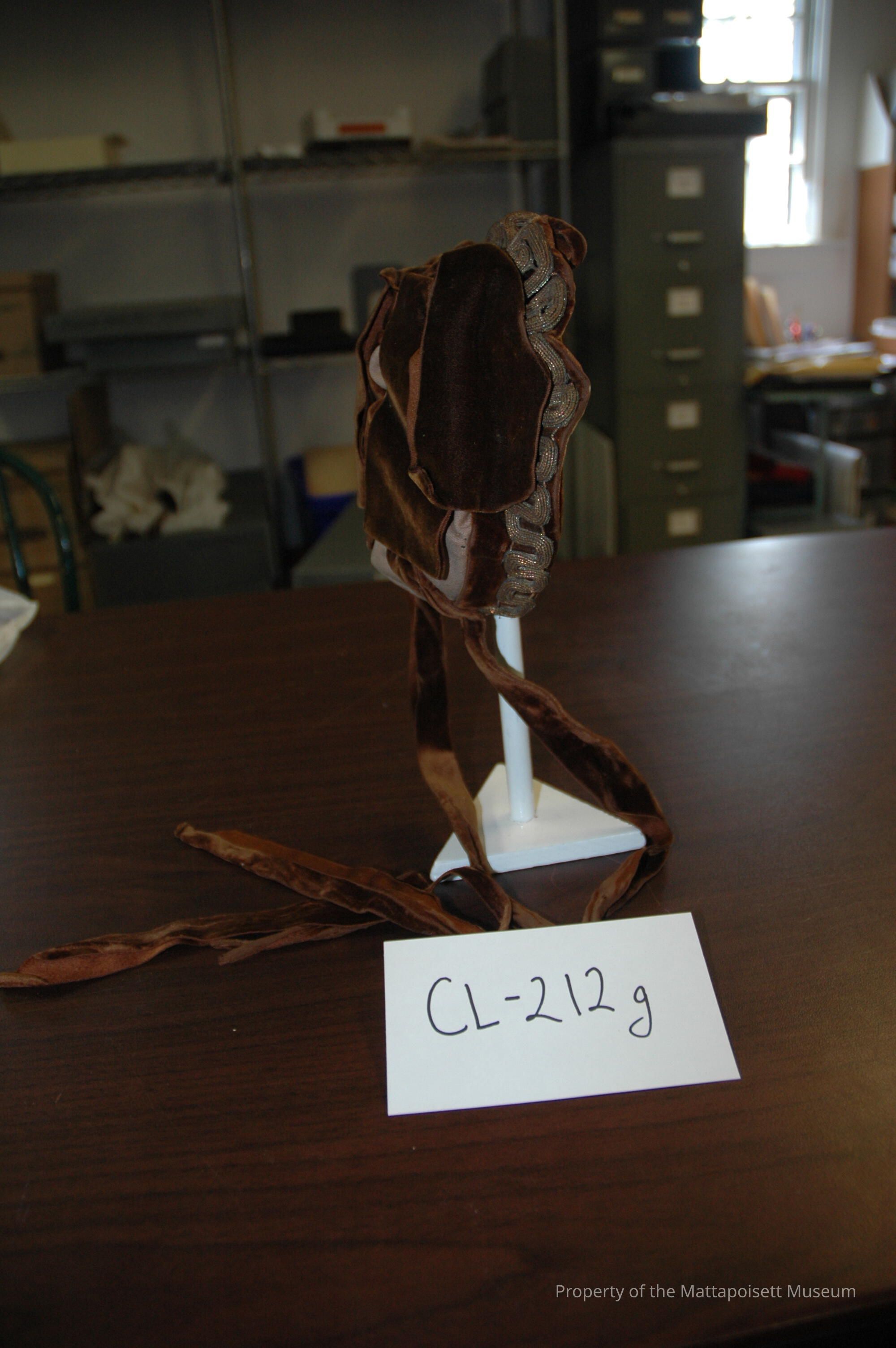 Brown velvet bonnet with metallic trim and ornament.Collection