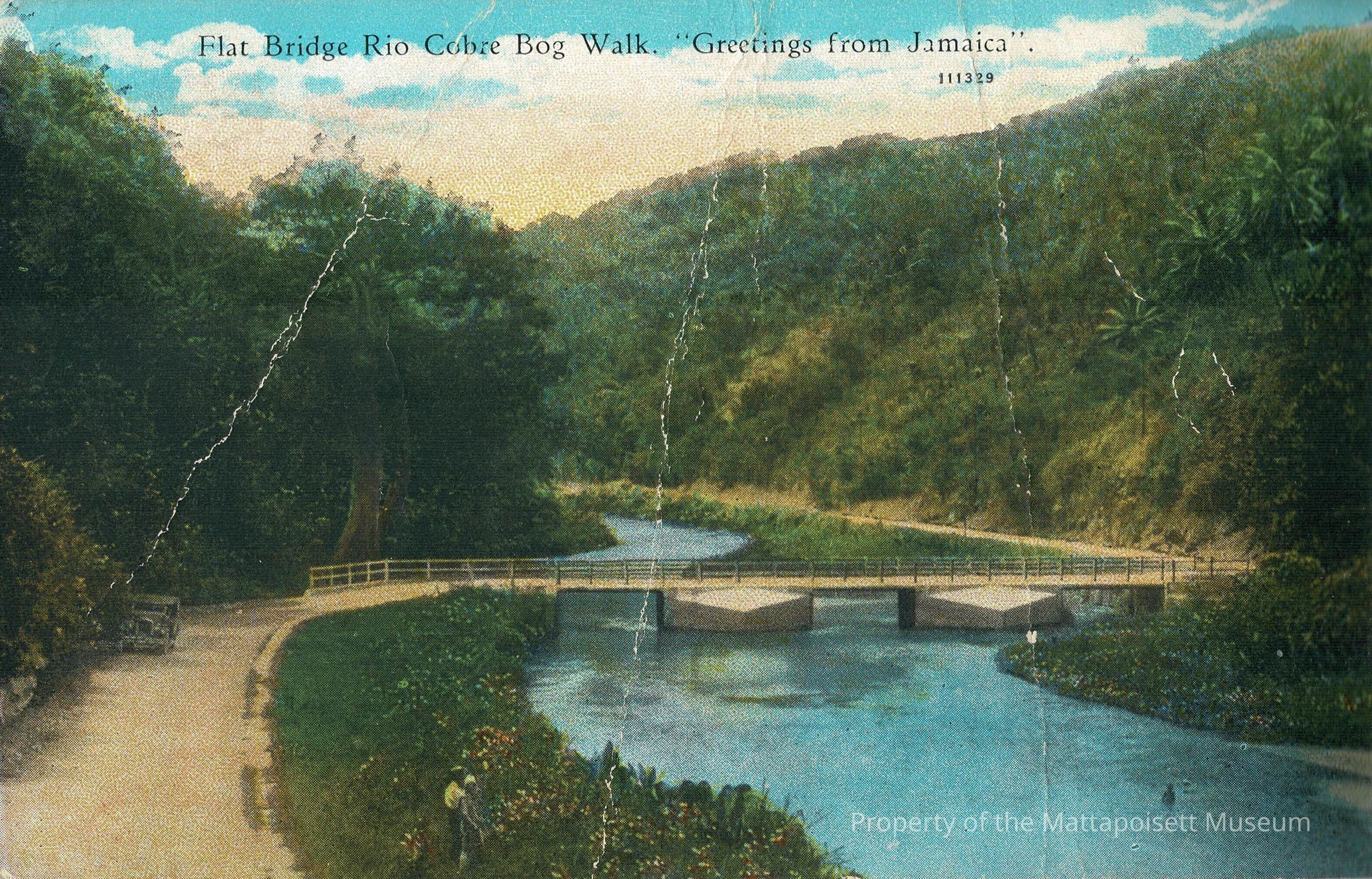 Hand-colored postcard showing Flat Bridge Rio Cobre Bog Walk, "Greetings from Jamaica".Collection