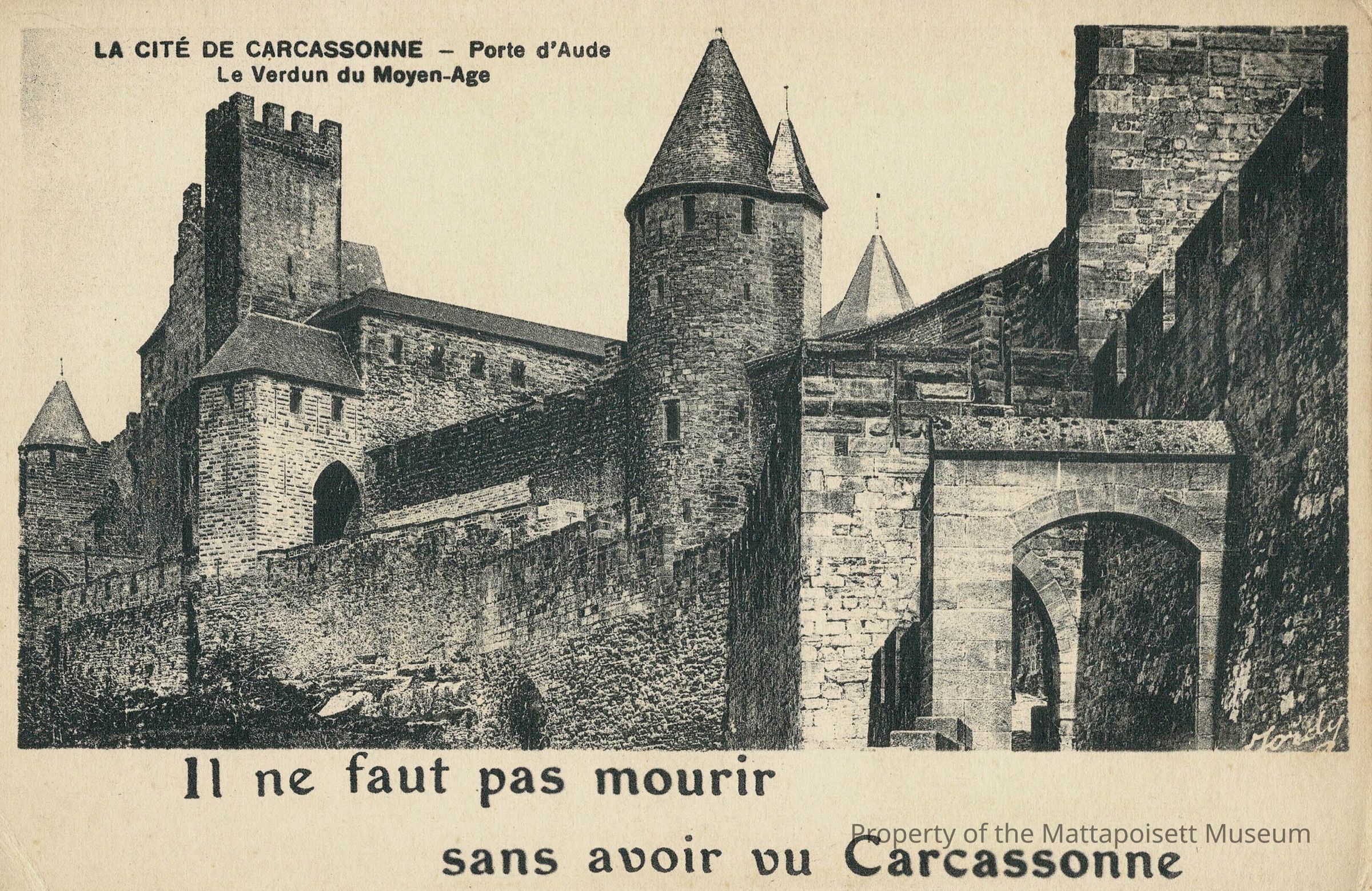 Printed text on the postcard reads "Il ne faut pas mourir sans avoir Carcassonne."Collection