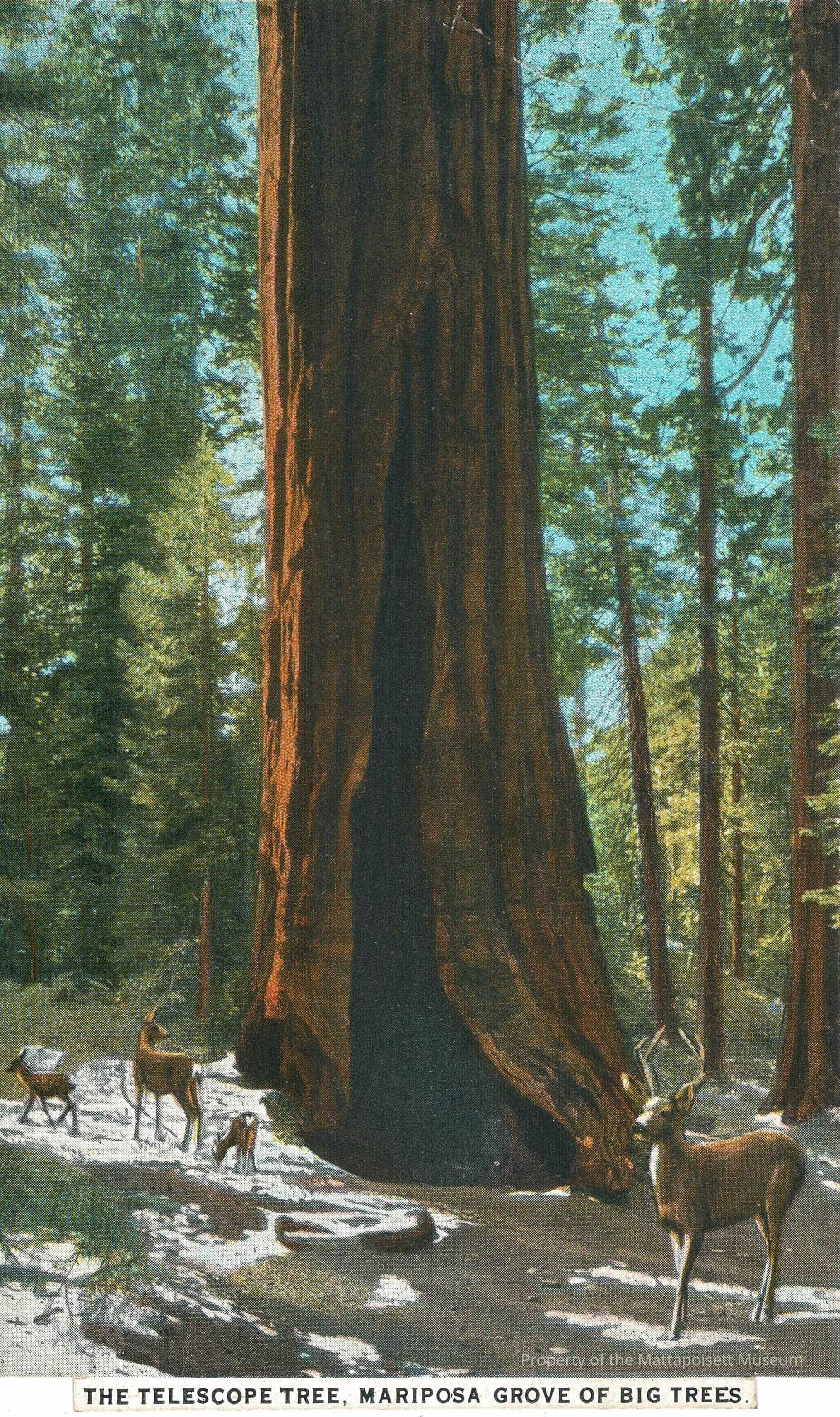 Hand-colored postcard showing The Telescope Tree, Mariposa Grove of Big Trees.Collection