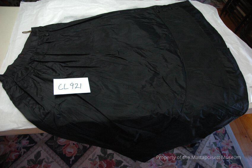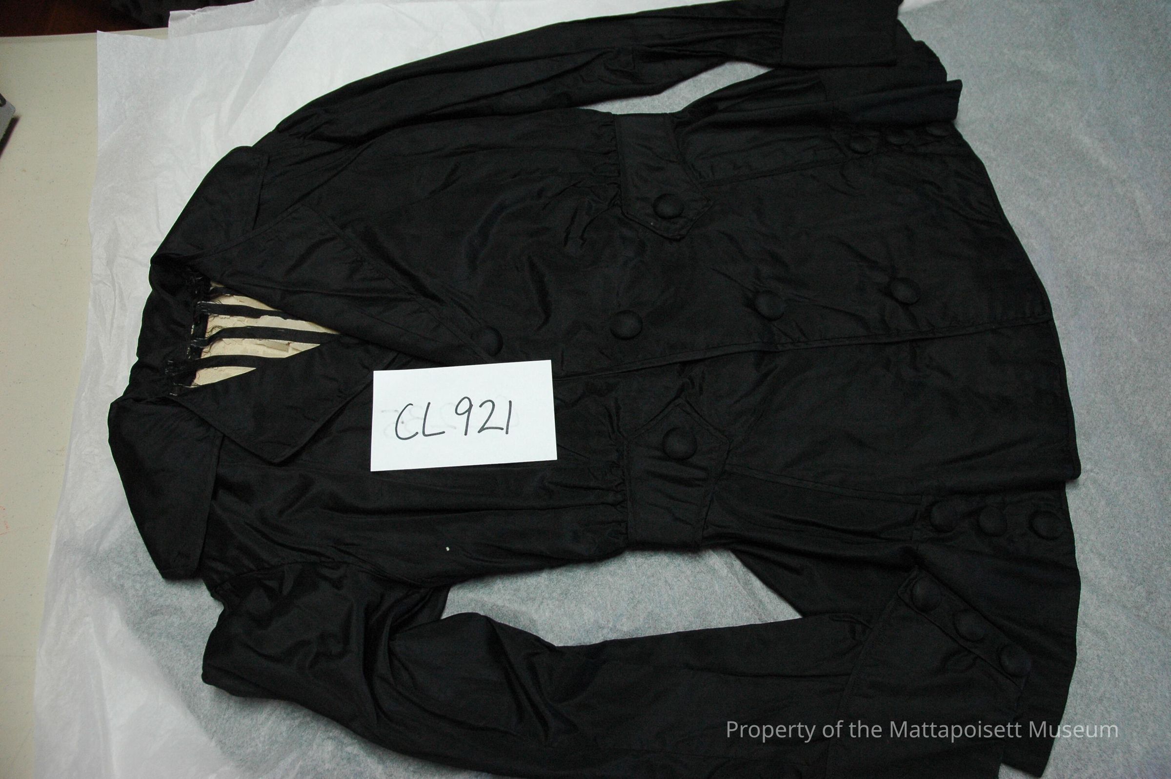 Notes: Notecard: Black silk two-piece suit. Long jacket with black and cream stipped lining. Buttons on cuffs and waist and hem of jacket and skirt. Owned by Patricia (Dennis) GossCreated By