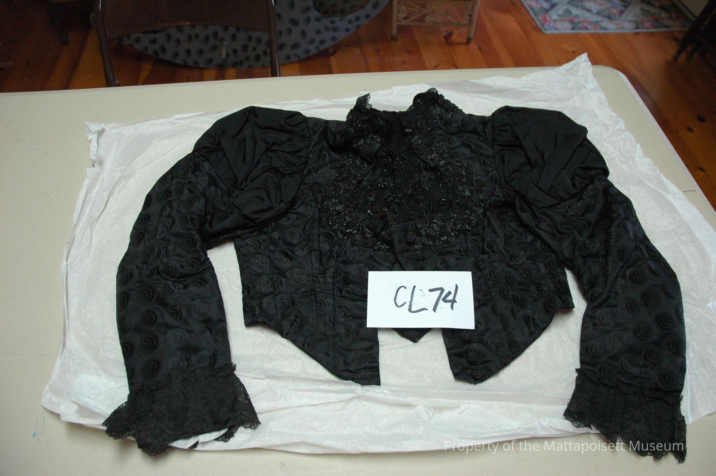 Black waist with leg-o-mutton sleeves. Lace trim at cuffs and collar. Jet bead detail at front closure near collar on lace inset and on fabric. Hook and eye closure with beaded buttons too. Busks (boning) all the way around.Collection