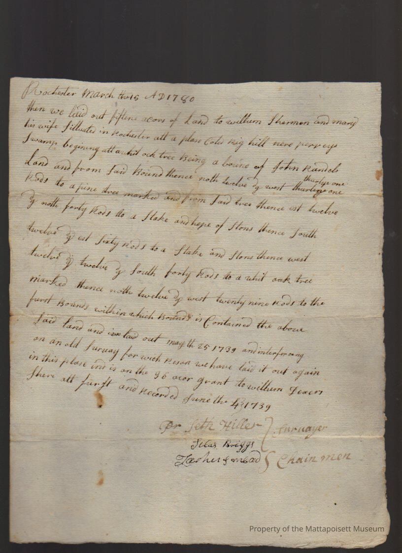Description of 15 acres of land laid out to William Shermon. Seth Hiller, surveyor.Collection