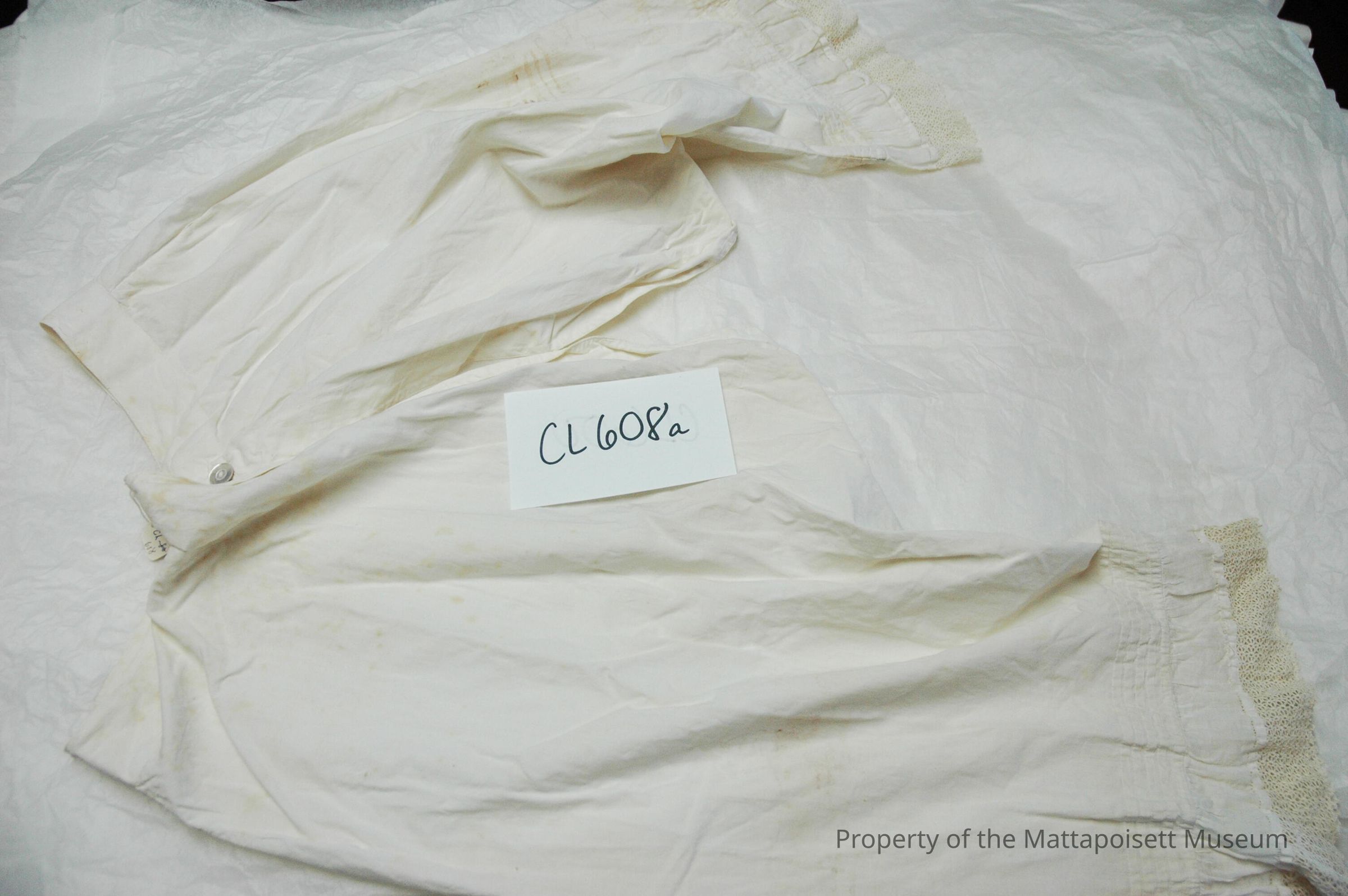 Notes: Notecard: Pantaloon, one pair. White cotton, crocheted trim. Originally there were six items under CL80, all but the one above were deaccessioned 1/6/2004.