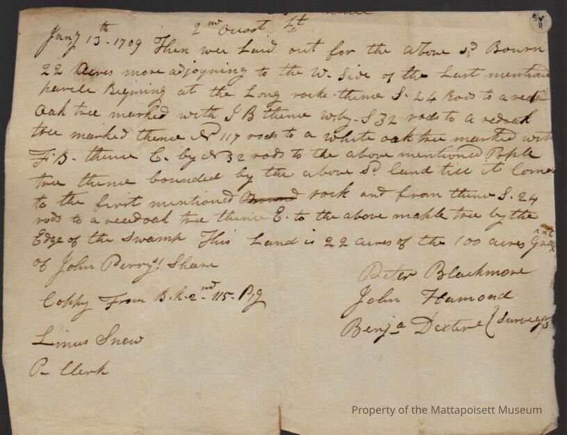 Copy of description of 22 acres, second Accoot lot for Capt. P. Pitcher, copy from Linus Snow, proprietors clerk.Collection