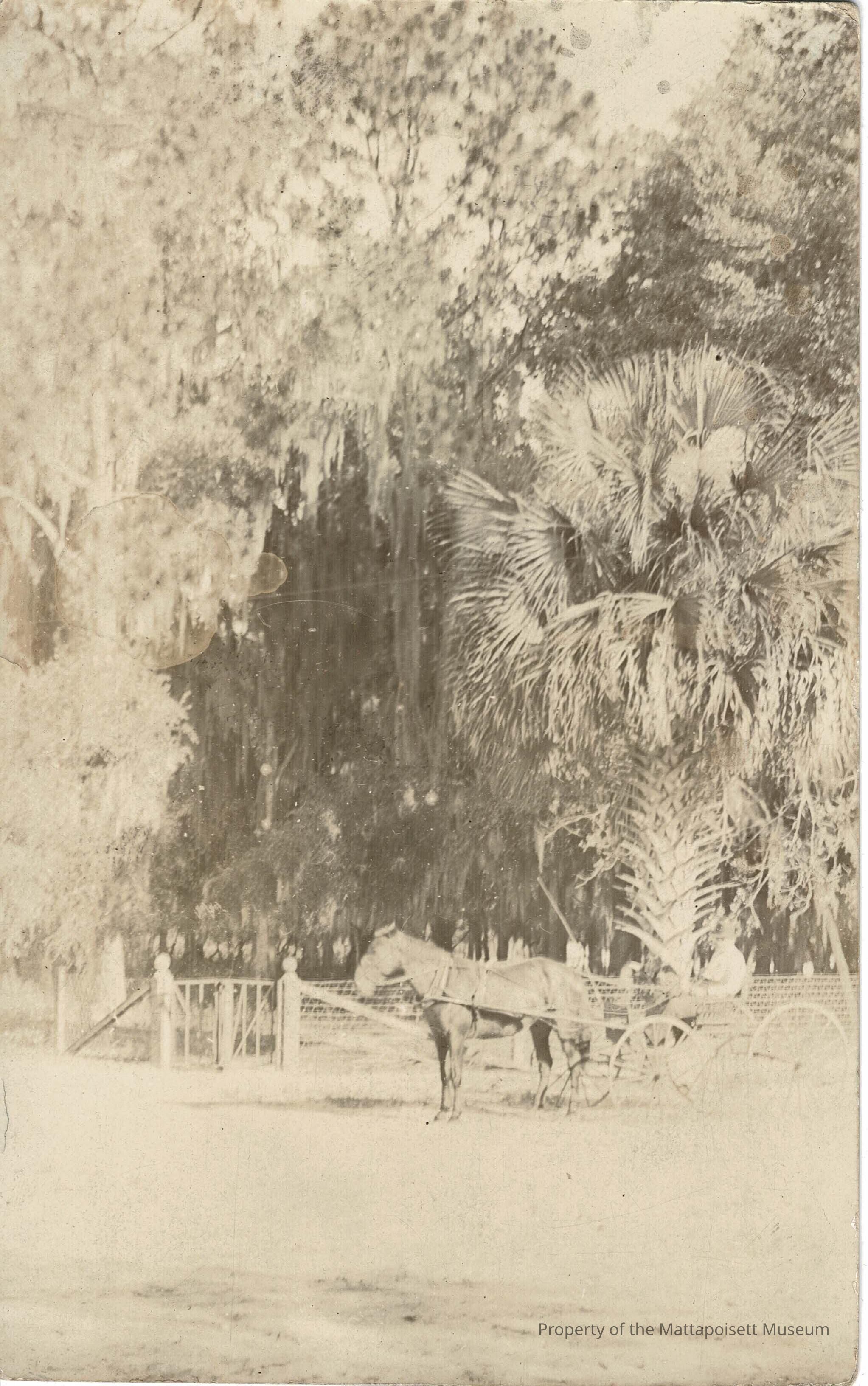 Black and white postcard with no description. Shows a horse and cart and tall tropical trees.Collection