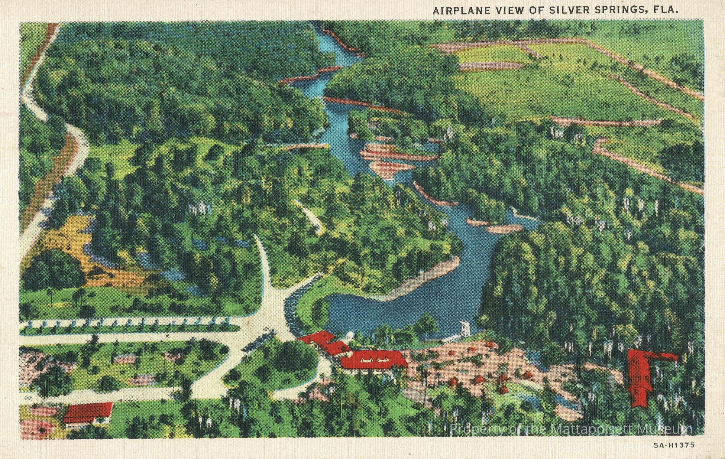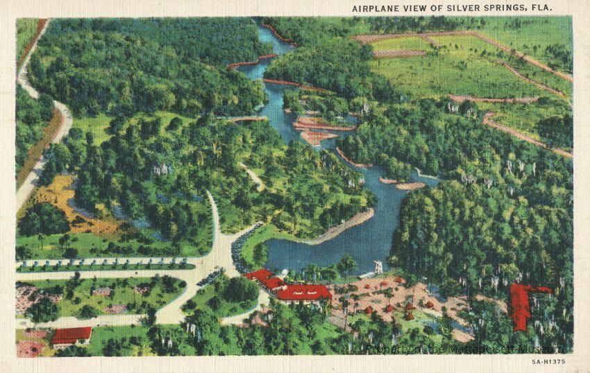 Hand-colored postcard showing Airplane View of Silver Springs, Florida.Collection