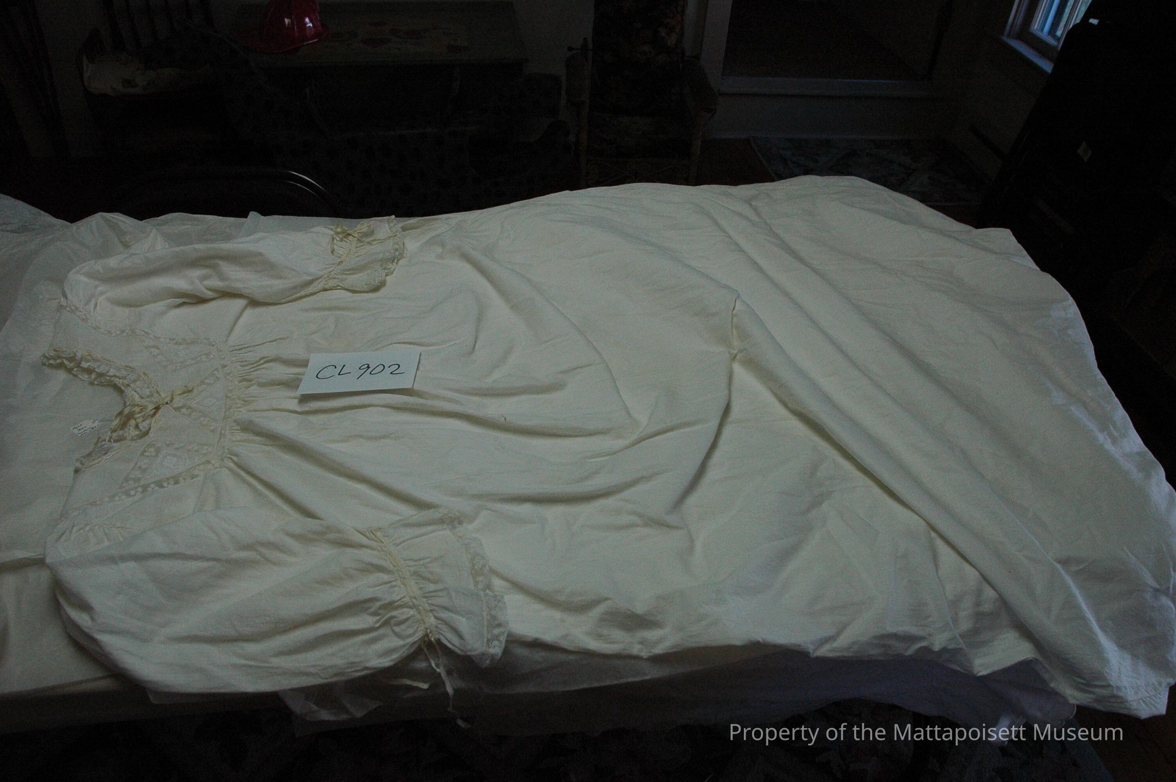 Notes: Notecard: Long white nightgown with lace trim collar and sleeves. Satin ribbon.