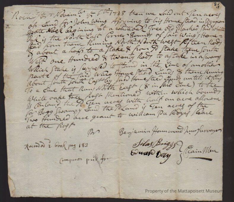 Description of 10 acres of land laid out for John Wing, Sippican "Grate Naek". Benjamin Hammond, surveyor.Collection