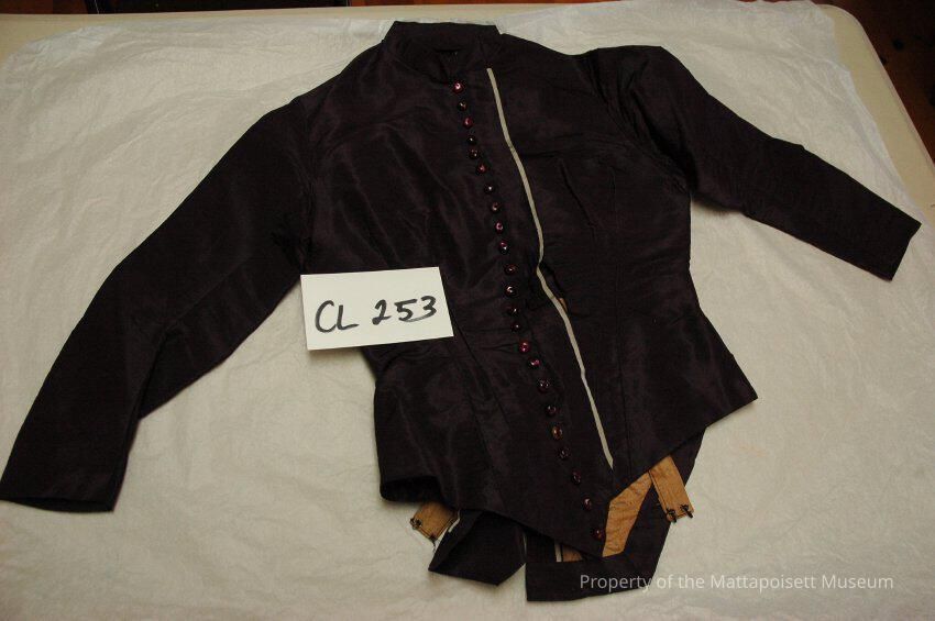 Notes: Notecard: Maroon silk waist with velvet trim with ceramic buttons. Calamanco lining.