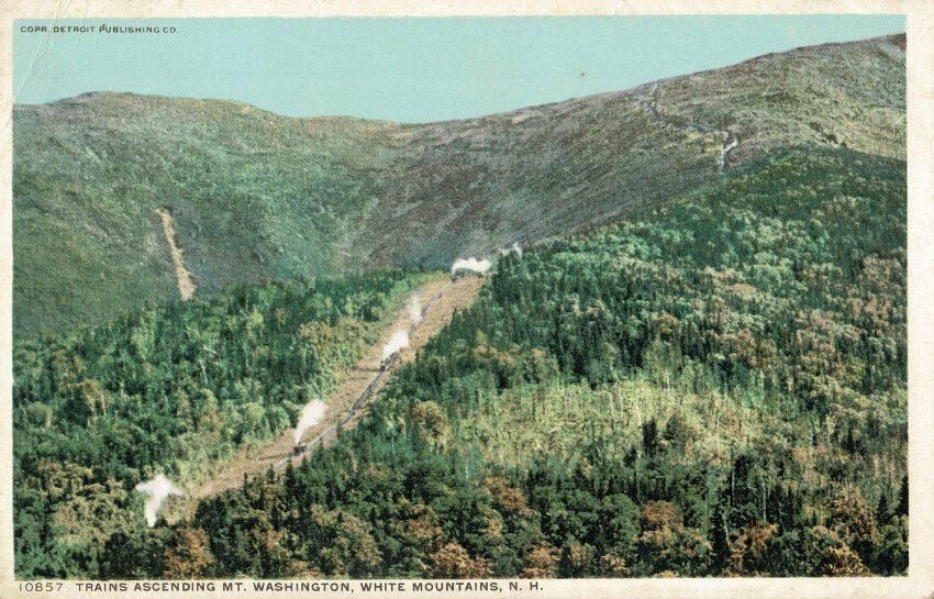 Hand-colored postcard showing Trains ascending Mount Washington, White Mountains, N.H.Collection