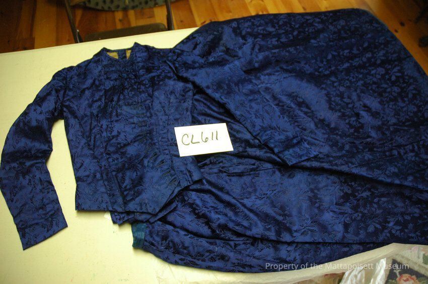 Notes: Notecard: Deep teal blue silk dress. Small lighter blue flowers pattern. Drop waist, bow at waist. Flapper.