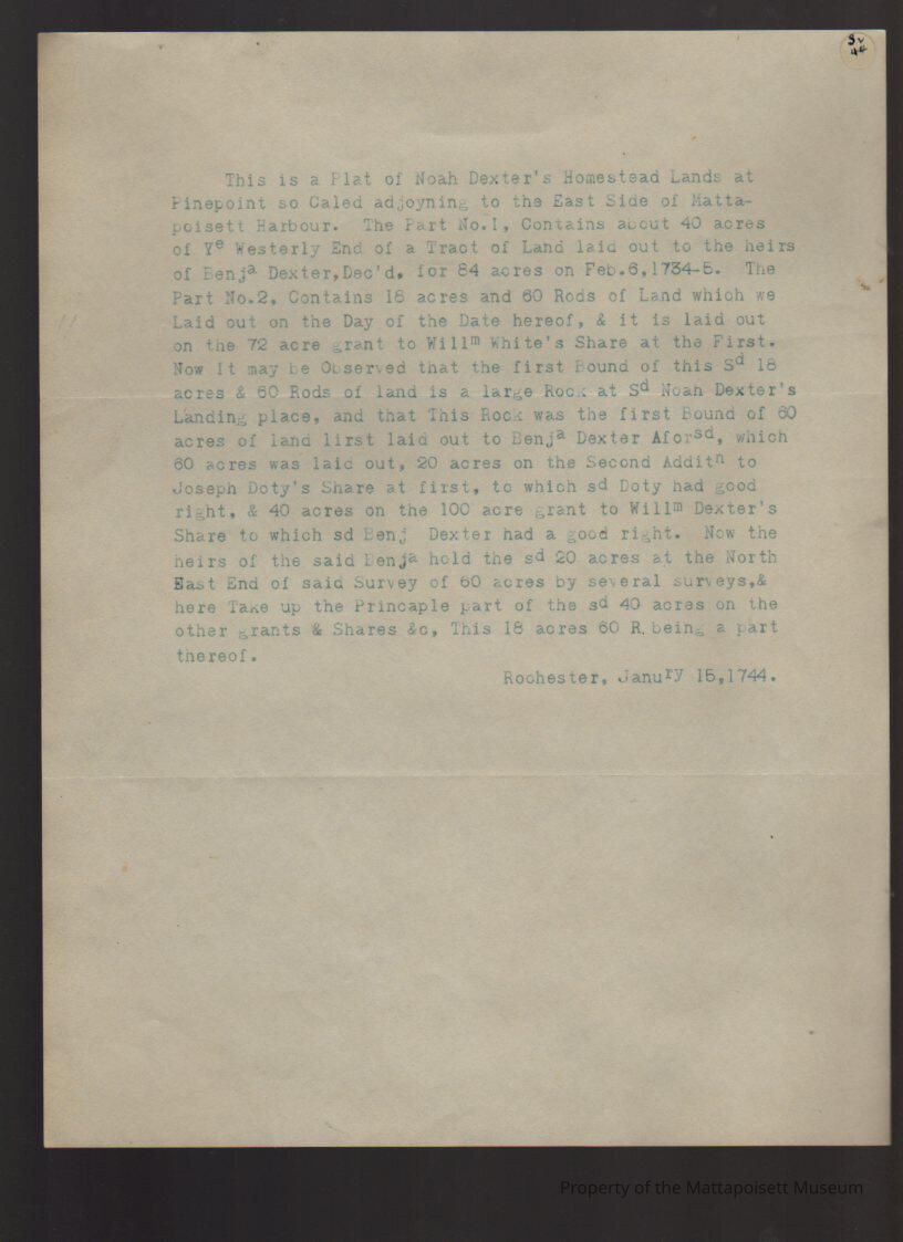 See .358, typed copy/transcription of plan of land of Noah Dexter, Pinepoint, on the east side of Mattapoisett Harbor, 40 acres.Collection