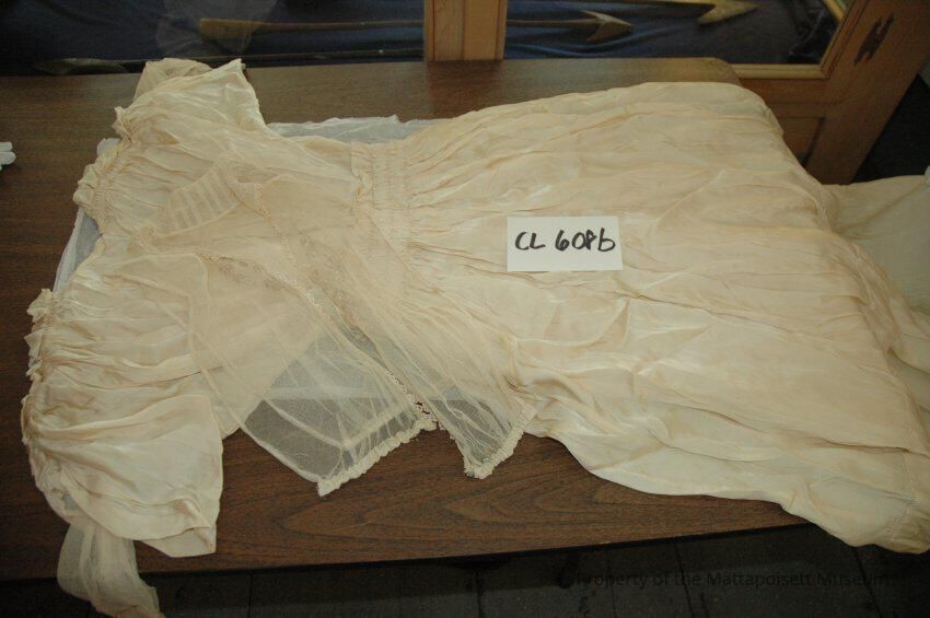 Notes: Notecard: Cream silk dress, lace at cuffs, shirred waist.