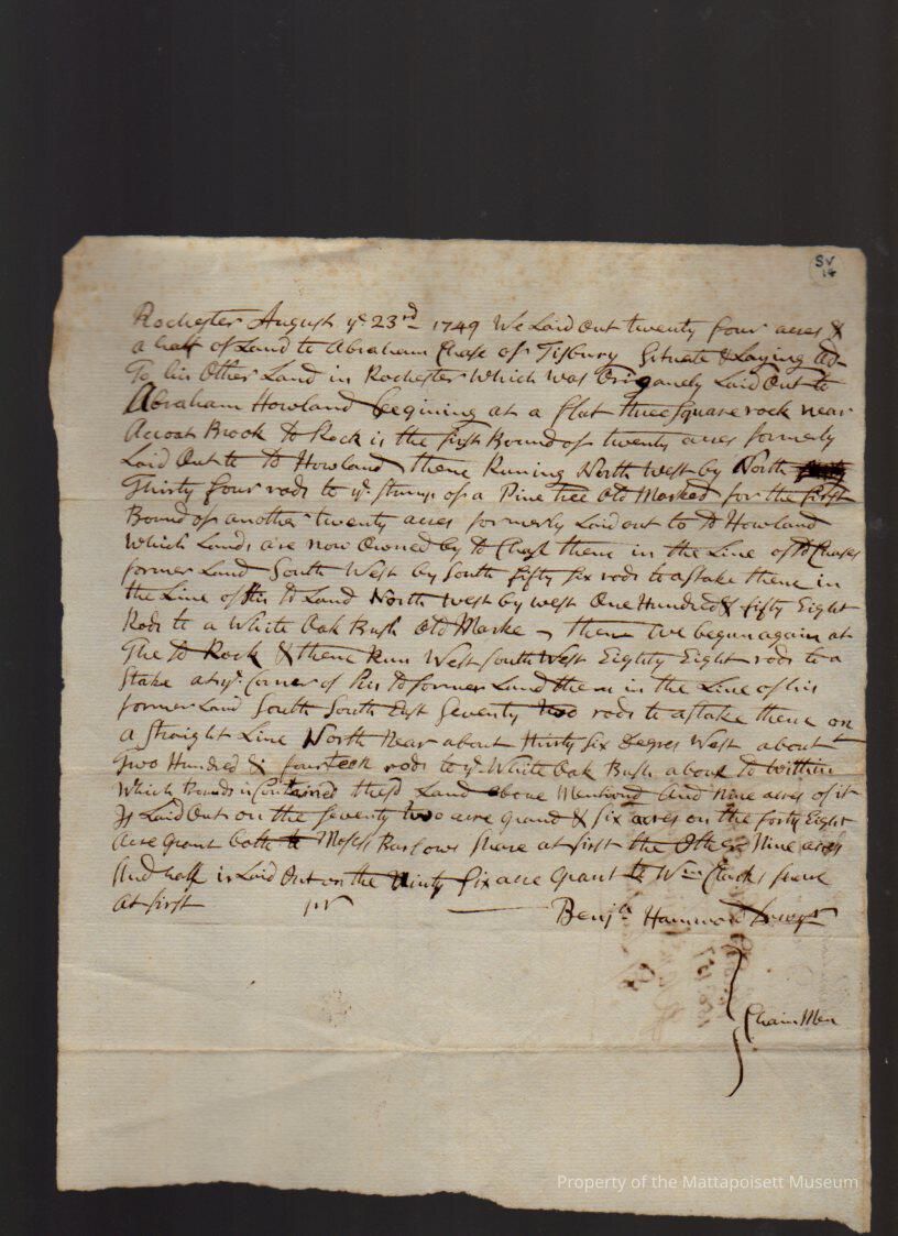 Description of 24 1/2 acres land laid out to Abraham Chase of Tisbury, near Accoot Brook. Benjamin Hammond, surveyor.Collection