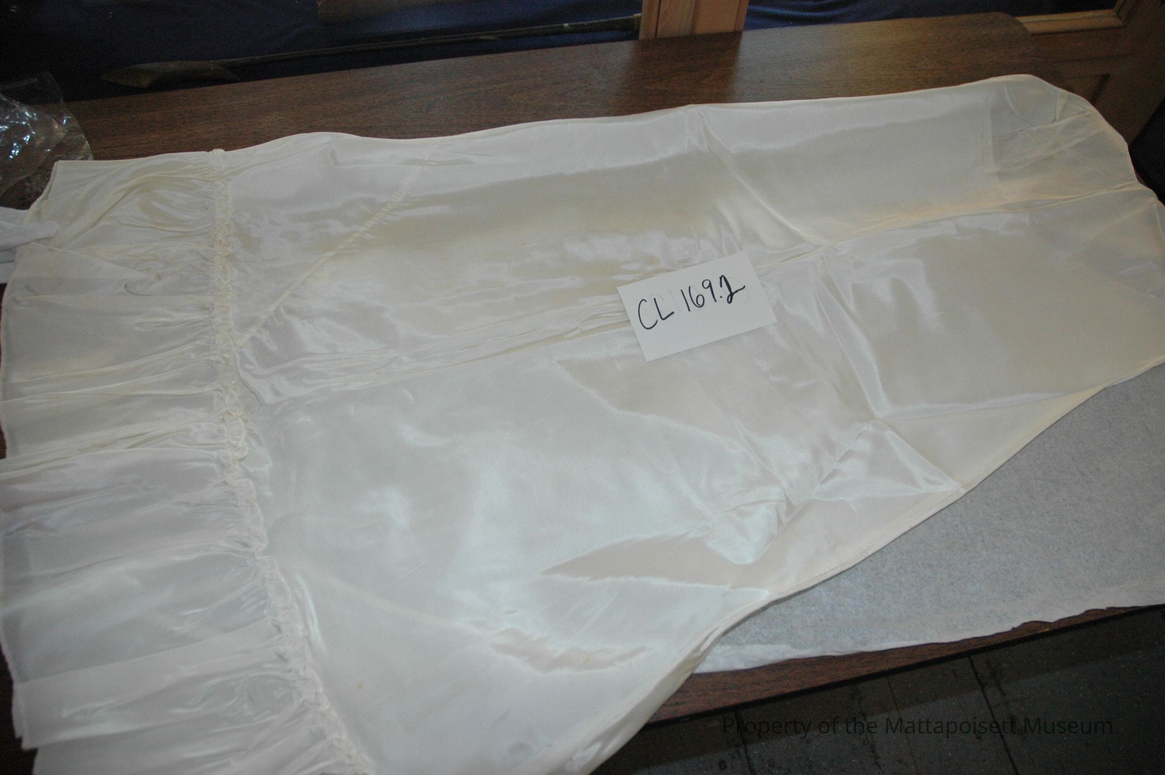 Notes: Notecard: White silk slip, cream satin slip with long ruffle.