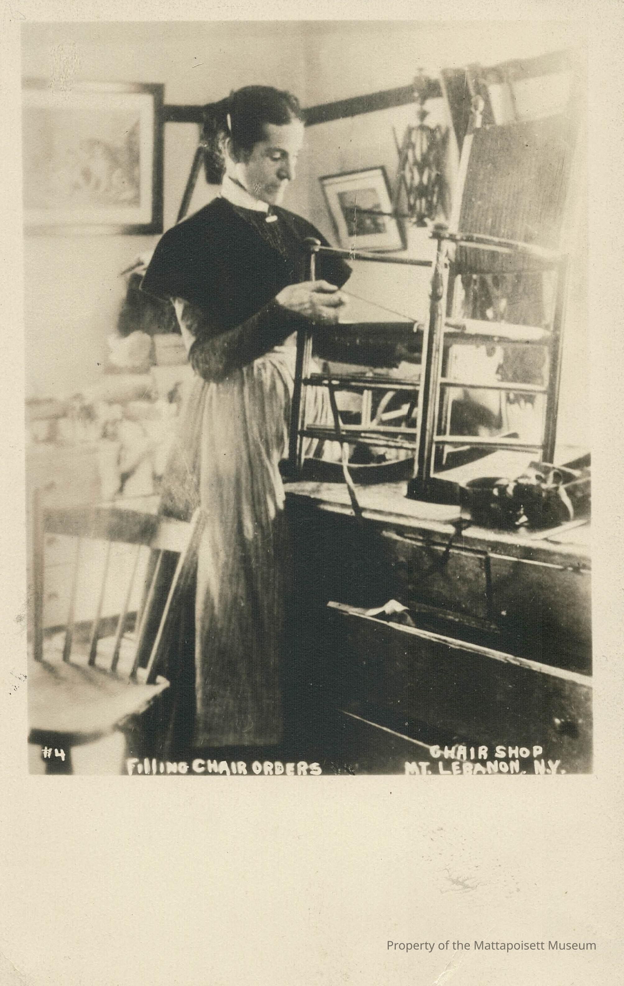 Black and white postcard showing Chair Shop, Mt. Lebanon, NY. Handwritten on reverse stating, "Sister Sarah Collins. She's 78 now, 1933. Taken about 20 years ago."Collection