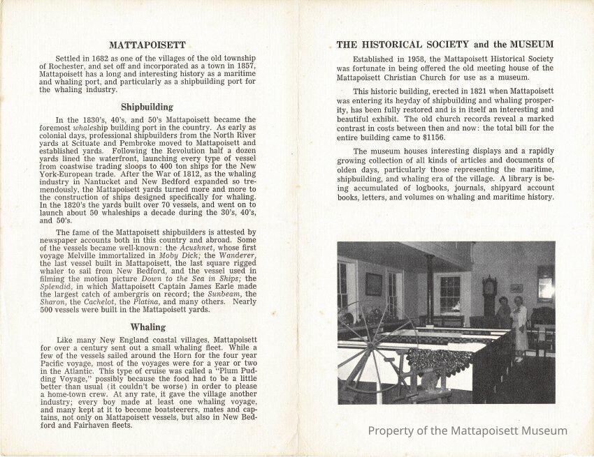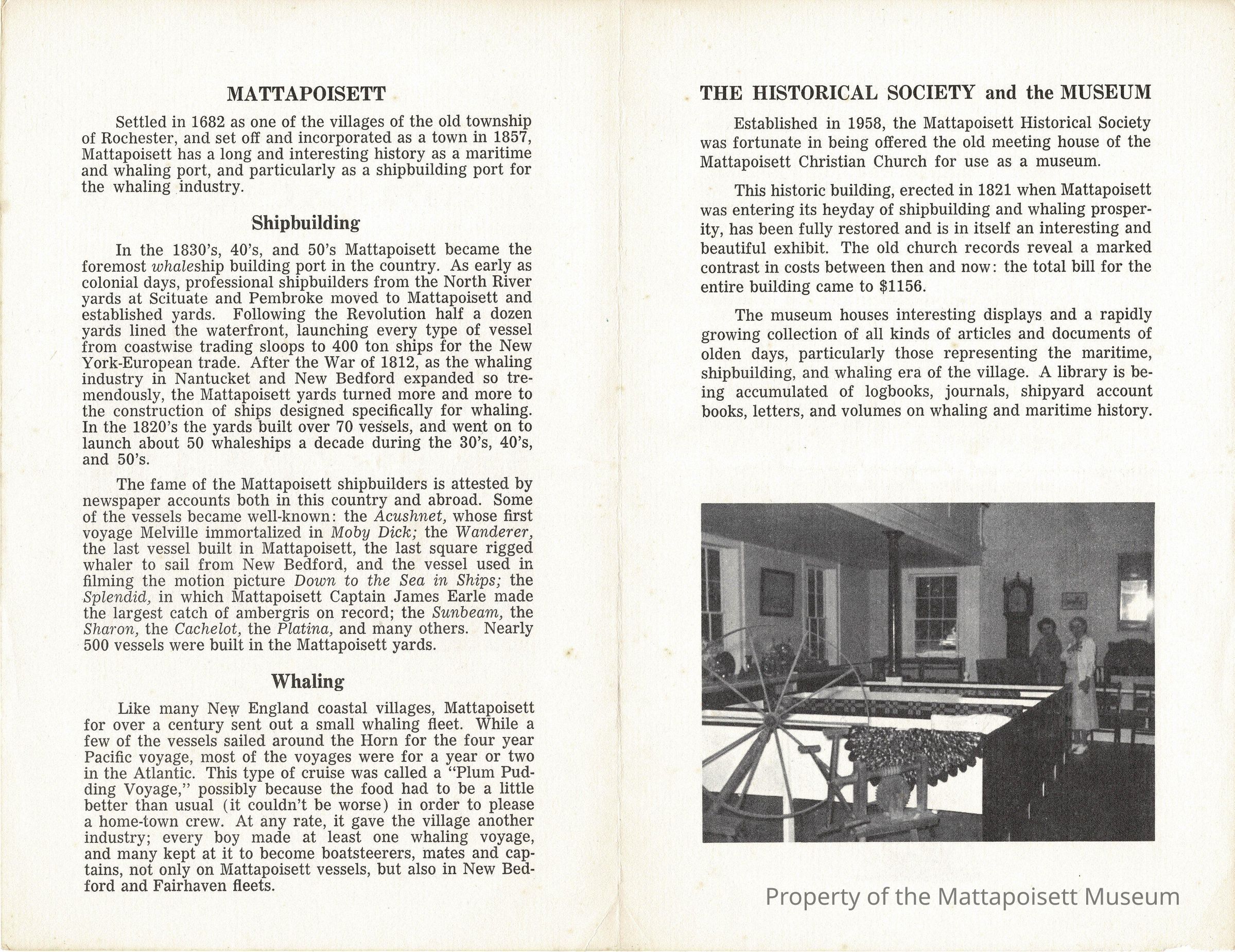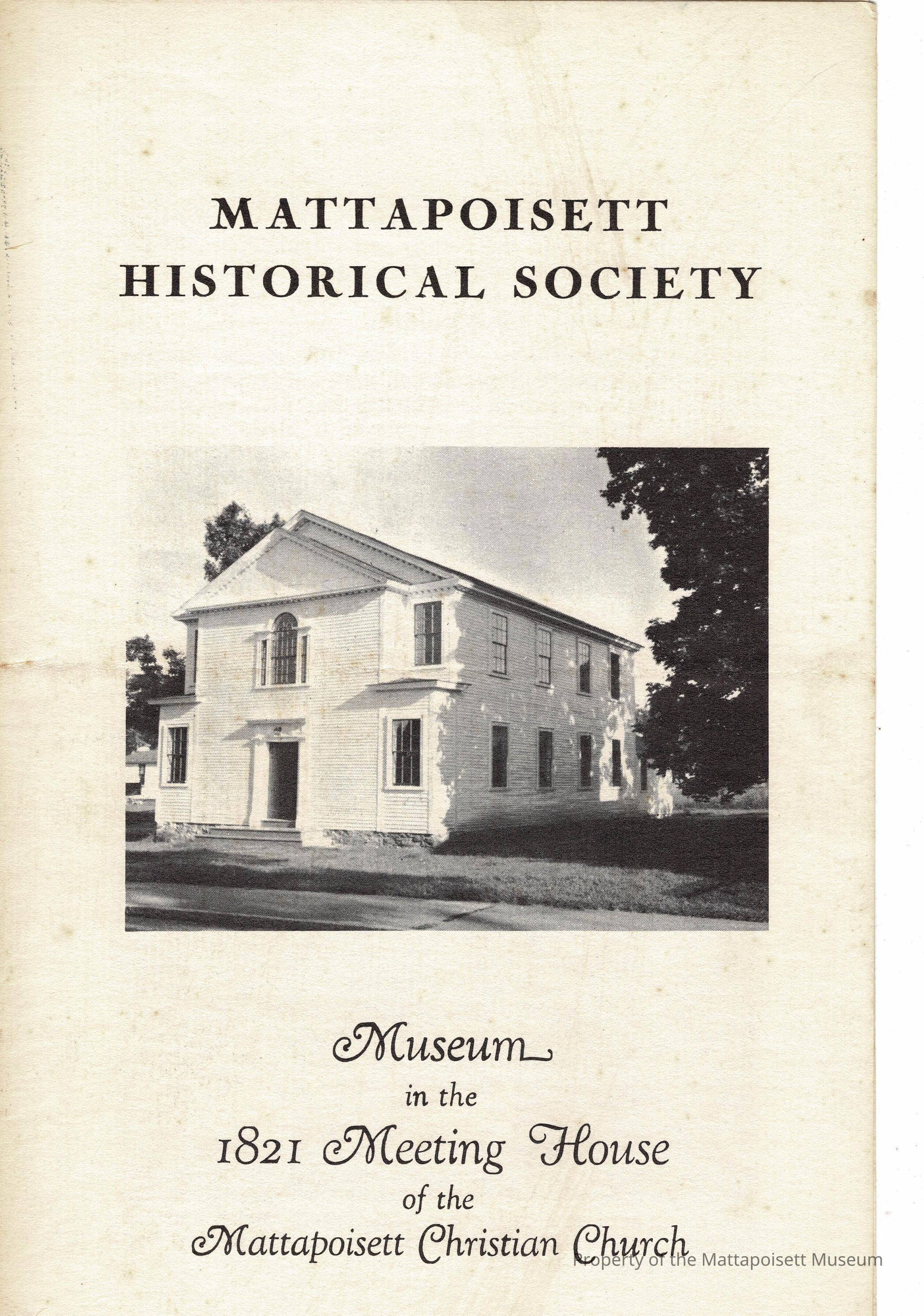 Pamphlet for Mattapoisett Historical Society Museum in the 1821 Meeting House of the Mattapoisett Christian Church. Photographs of building before carriage house and pulpit.Collection