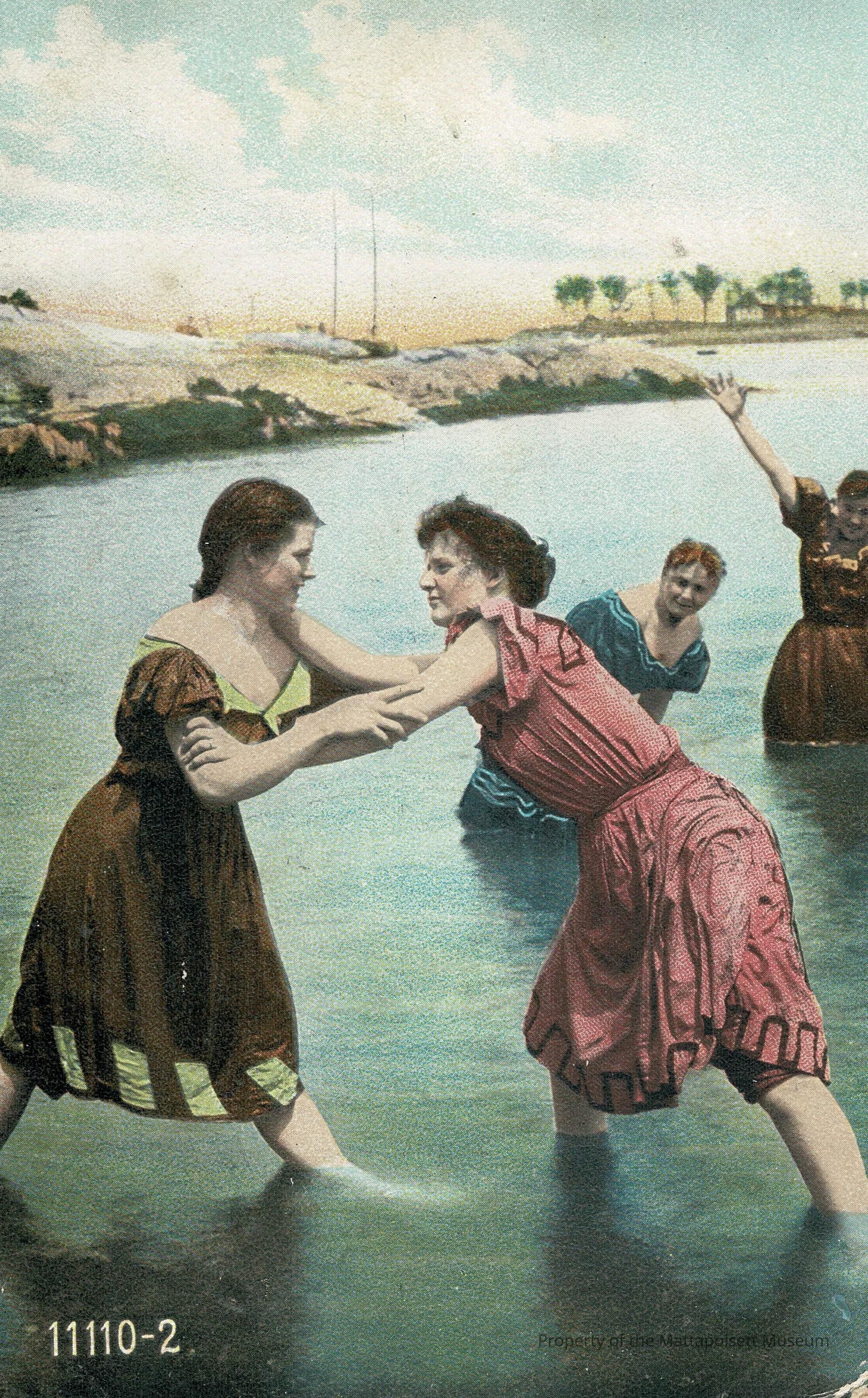 Hand-colored postcard showing women bathing in a bay. No title or indication of location of scene. Handwritten note to Miss Lizzie Taylor, Harwich Center, Mass. Postmark and message not legible.Collection
