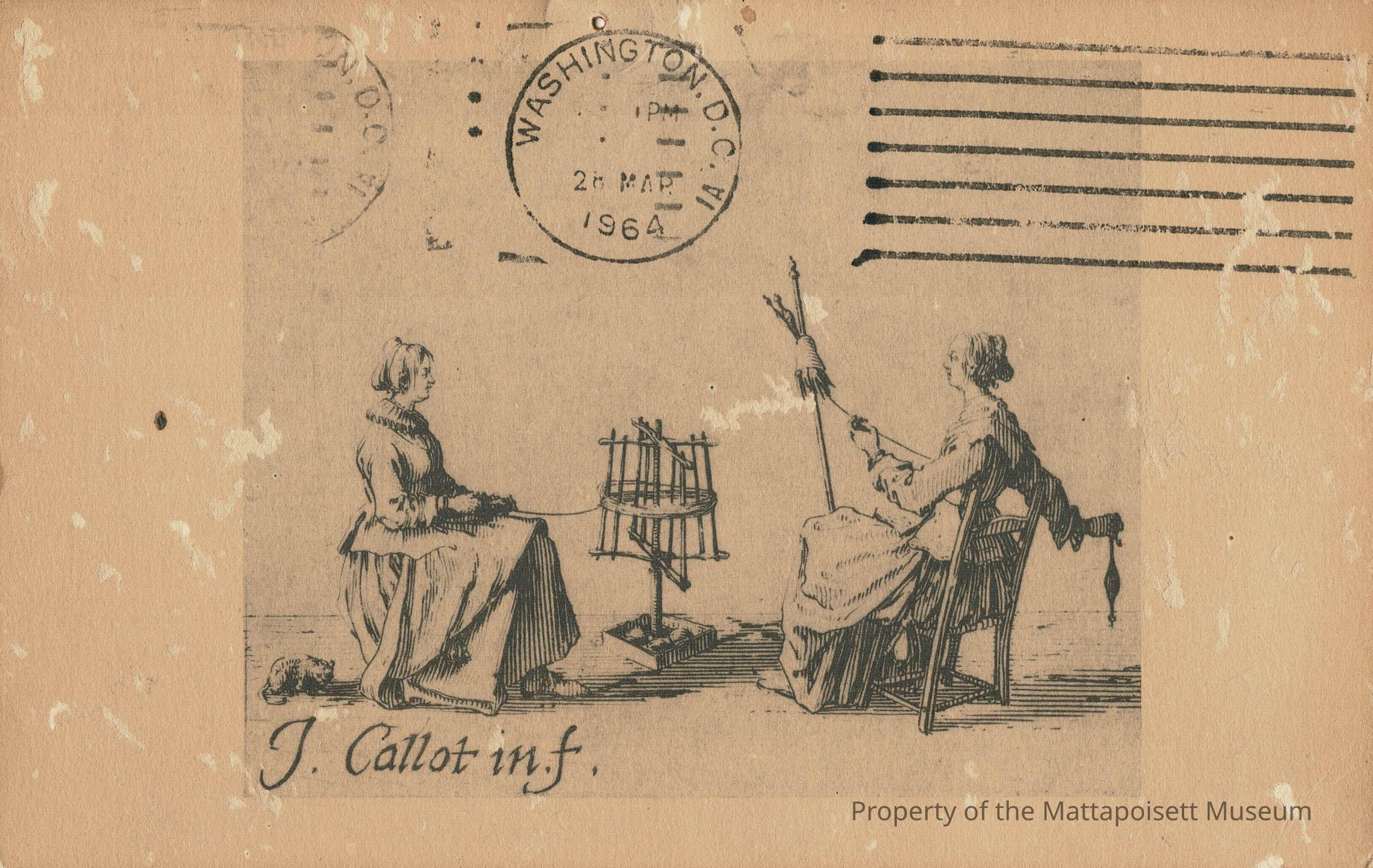 Black and white postcard showing "The Spinners". Handwritten note to Miss Minerva Sparrow, Church Street, Mattapoisett, Massachusetts. Postmarked from Washington D.C. on 28 March 1964.Collection