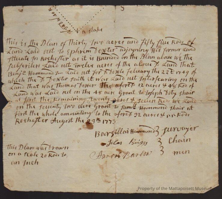 Plan of land (actual plan is missing, so it's mostly description) containing 32 acres and 55 rods laid out to Ephrem Dexter. Barzillai Hammond, surveyor.Collection