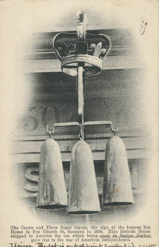 Black and white postcard showing The Crown and Three Sugar loaves, the sign of the famous Tea House in Fen Church Street founded in 1650. This historic House shipped to America the tea which being sunk in Boston Harbor gave rise to the war of American Independence. Handwritten note to Mrs. George Purrington, Jr., Mattapoisett, Mass. U.S.A. Postmarked from West Kensington, on June 25, 1906 and Postmarked received Mattapoisett, Mass, July 6, 1906. Stamped Due 4 Cents, July 5, 1906.Collection