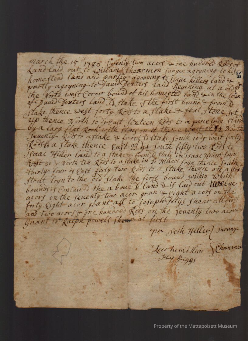 Description of 22 acres and 100 rods of land laid out to William Shearman Jr. . Seth Hiller, surveyor.Collection