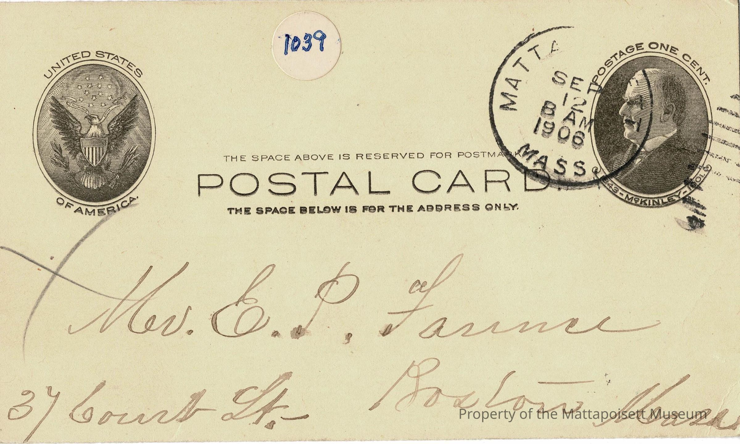 Black and white post card blank with prestamped McKinley postage one cent. Handwritten note to Mr. E. P. Faunce, 37 Court Street, Boston, Mass. from Mother. Postmarked September 12, 1906, Mattapoisett, Mass.Collection