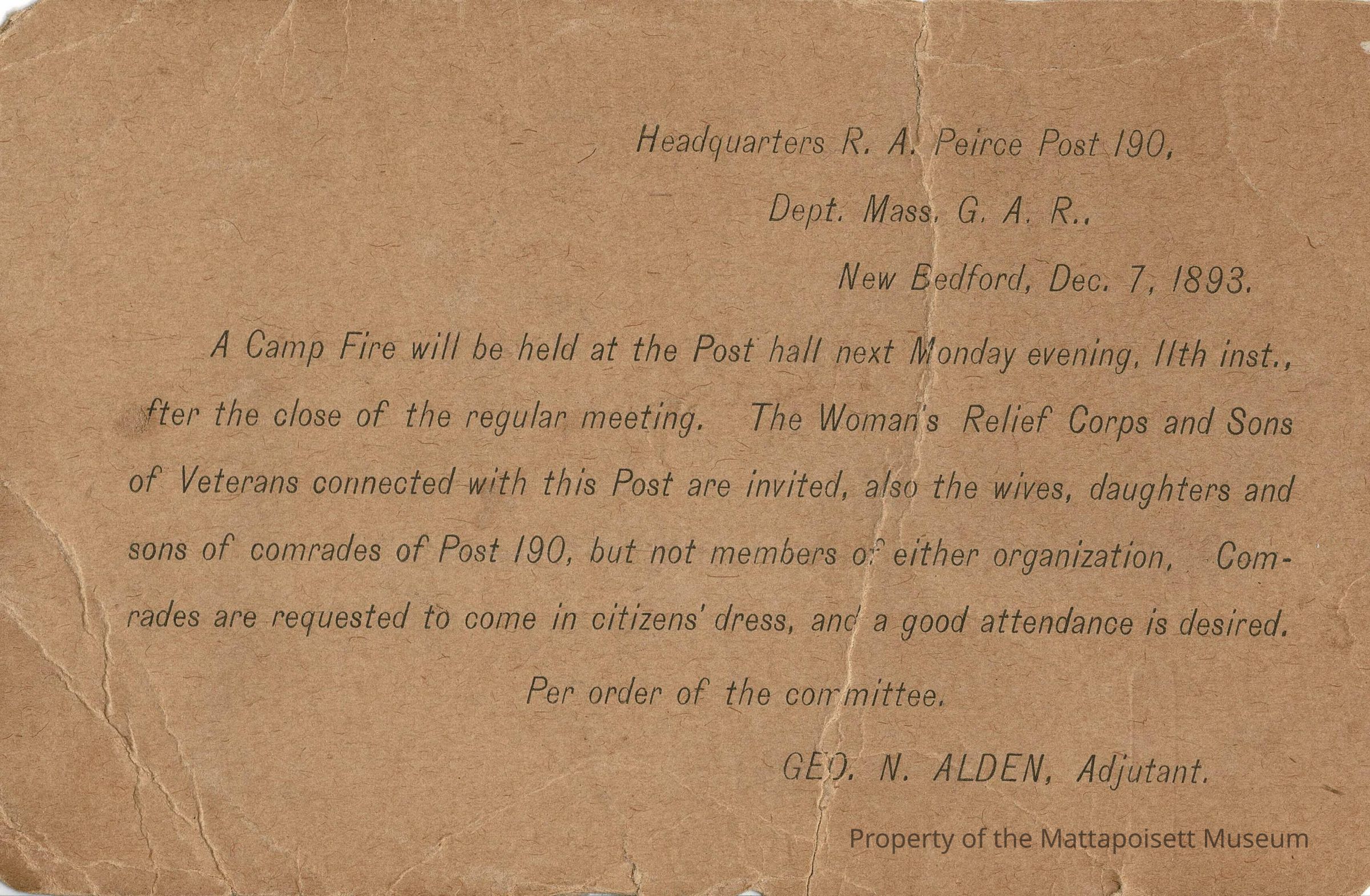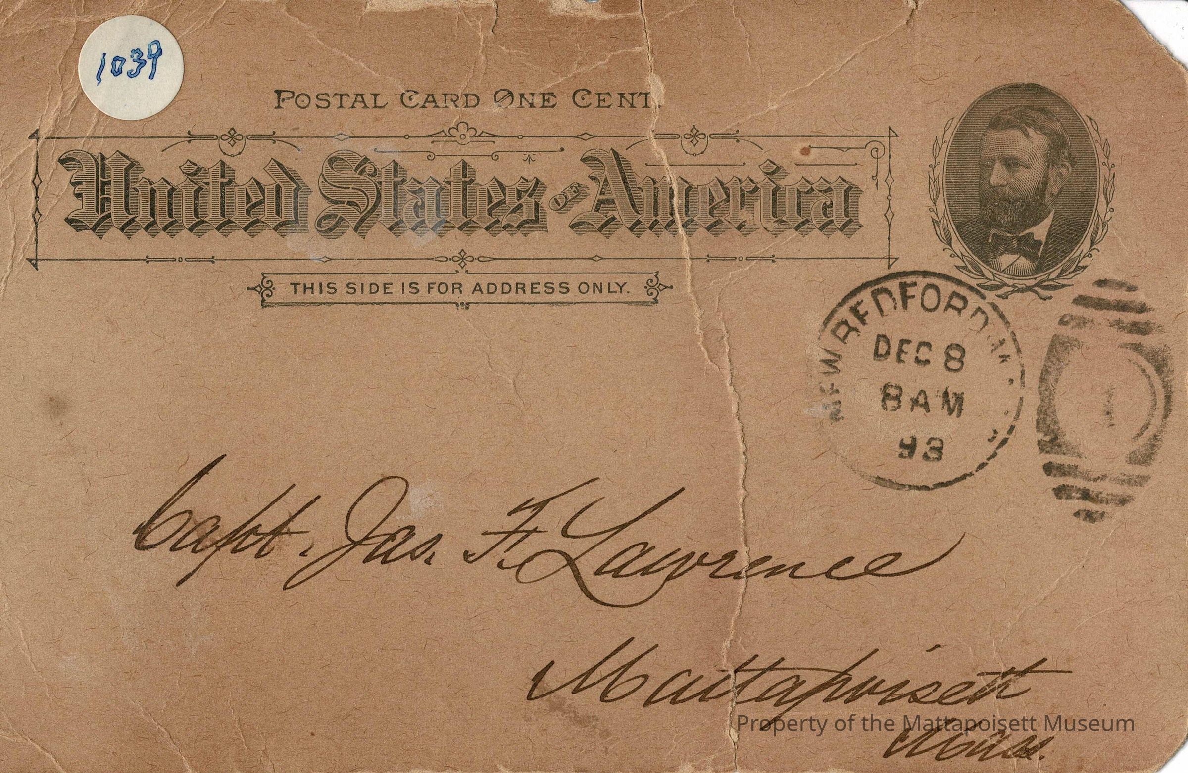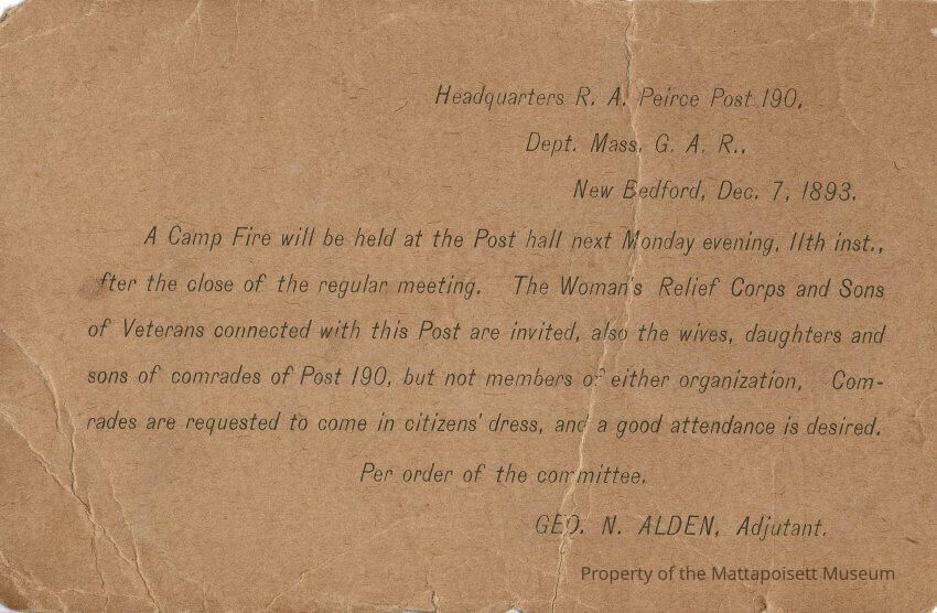 Black and white postal card - one cent - United States of America and addressed to Capt. Jas. F. Lawrence, Mattapoisett, Mass. Postmarked December 8, 1893 from New Bedford, Mass. Preprinted invitation from Geo. N. Alden, Adjutant, Headquarters R.A. Peirce Post 190, Dept. Mass. G.A.R., New Bedford, Dec. 7. 1893.Collection