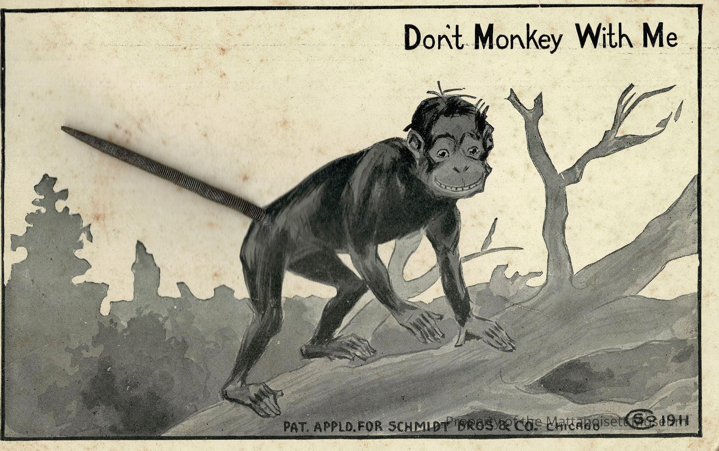 Black and white postcard showing "Don't Monkey With Me".Collection
