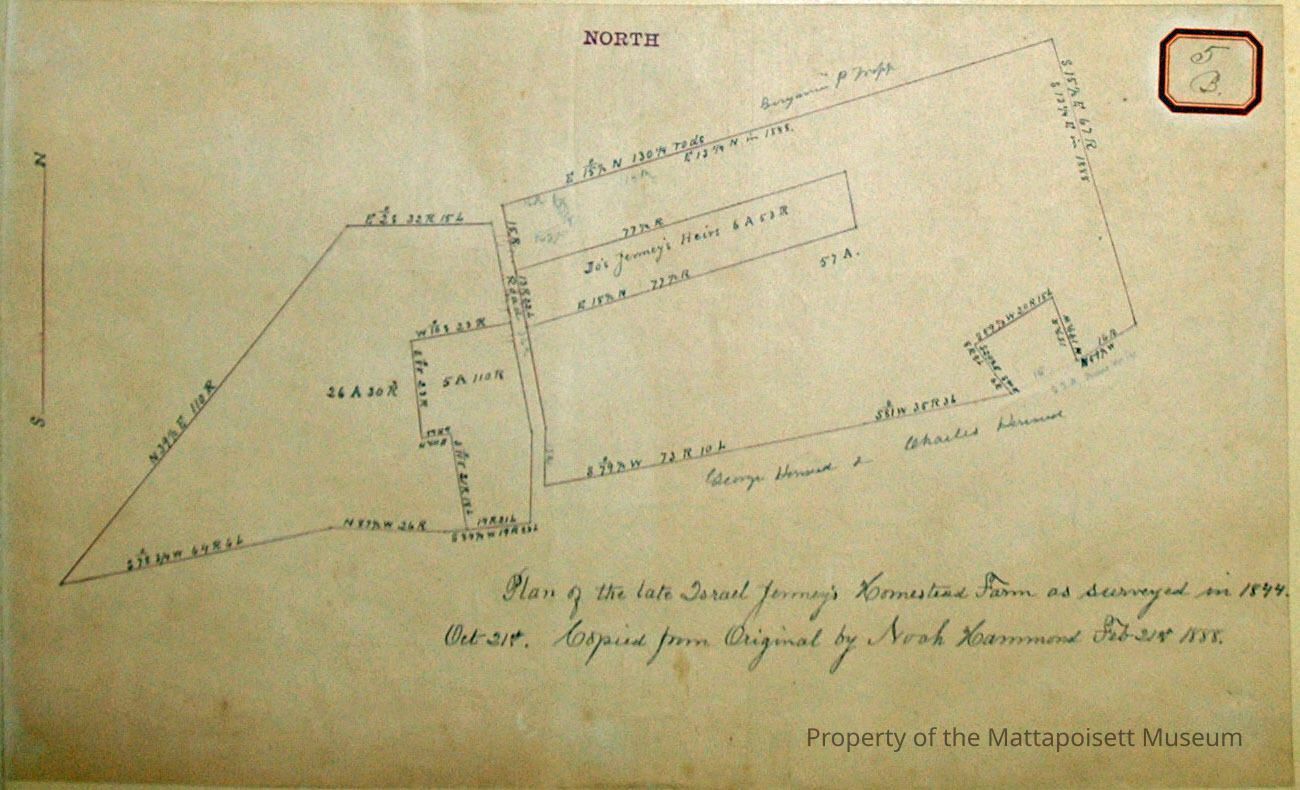 Plan of the late Isreal Jenney's Homestead Farm as surveyed October 21, 1844. Copied from the original by Noah Hammond, February 21, 1888. Abutters are Benjamin Tripp, George and Charles Howard, Jo's Jenney's Heirs.Acquisition