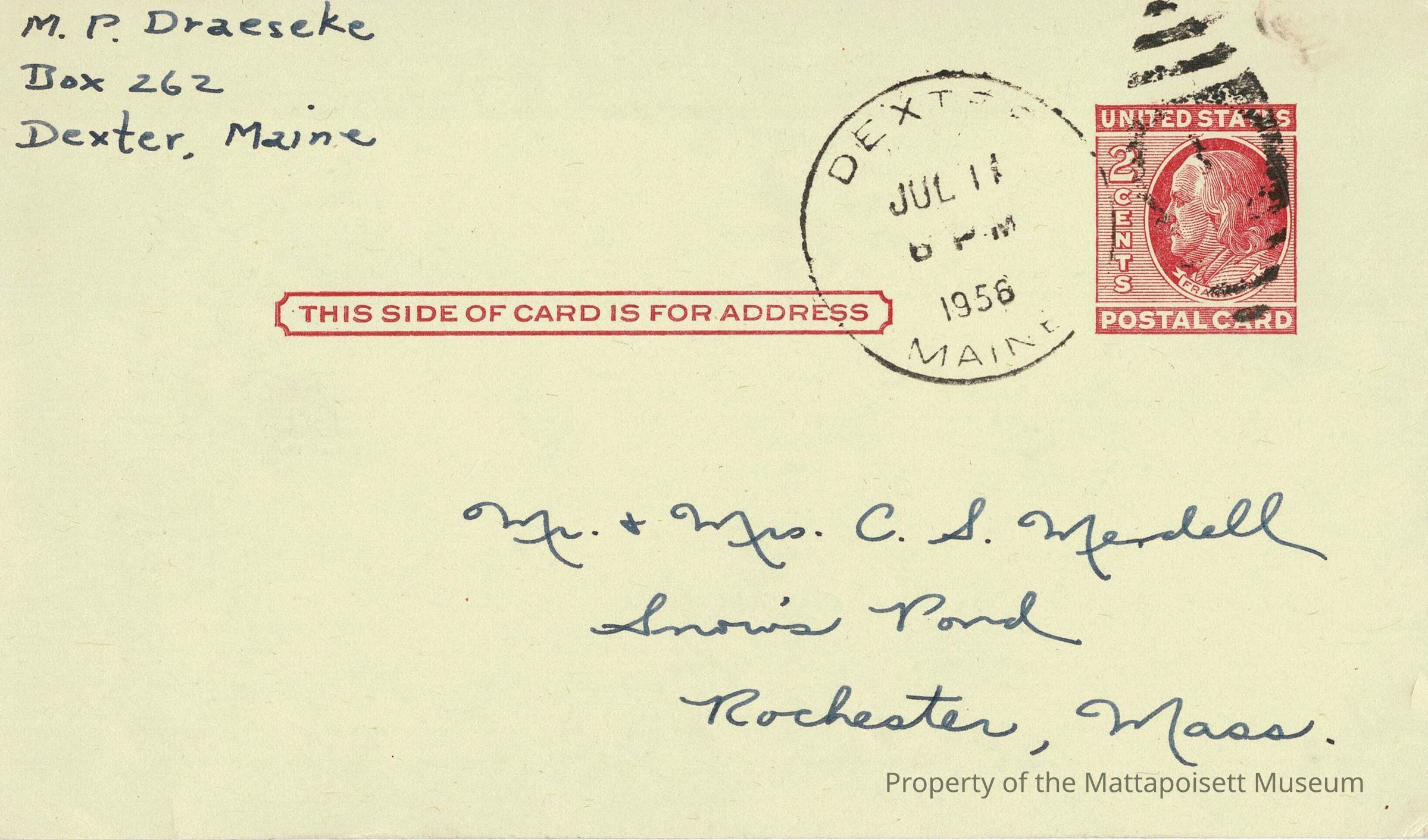 Blank postal card with two-cent pre-stamped card from M.P. Draeseke, Box 262, Dexter, Maine to Mr. and Mrs. C.S. Mendell, Snow's Pond, Rochester, Mass. Postmarked July 11, 1956, Dexter, Maine.Collection