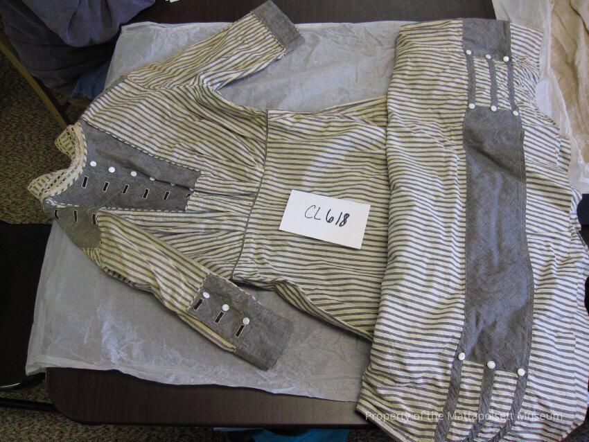 Notes: Notecard: Dress: grey and white. Striped with grey trim. White inset, white buttons.