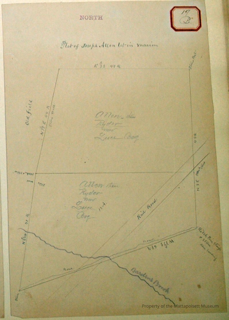 Part of Joseph Allen lot in Marion. Barden's Brook and Railroad run through. Note in pencil: Allen, then Ryder, now Luce Bog.Acquisition
