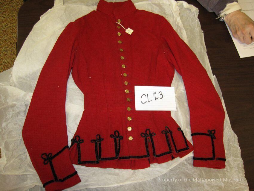 Red wool jacket patterned weave. Trimmed with black tab collar. Black ribbon. Gold decorated buttons. Silk faille neck panel.Collection