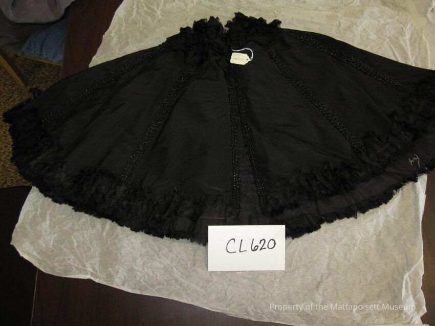 Notes: Notecard: Black faille cape. Lace ruffing and beaded stripe.