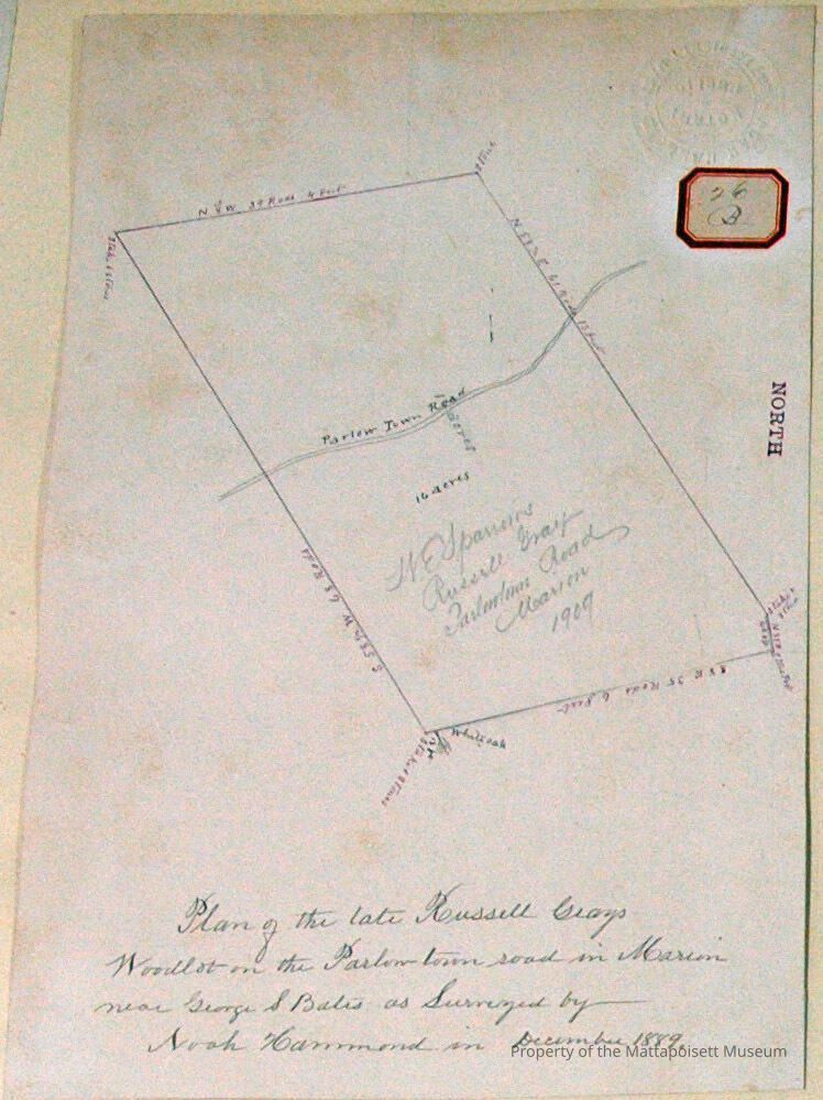 Plan of the late Russell Gray's woodlot on the Parlowtown Road in Marion near George S. Bates as surveyed by Noah Hammond in December 1889. 16 acres.Acquisition