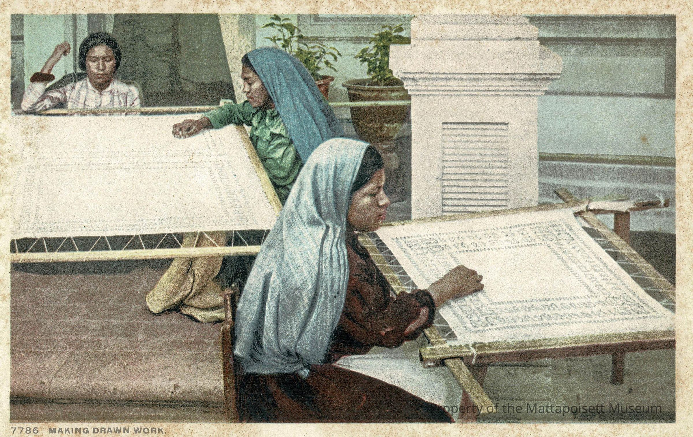 Hand-colored postcard showing Making Drawn Work.Collection
