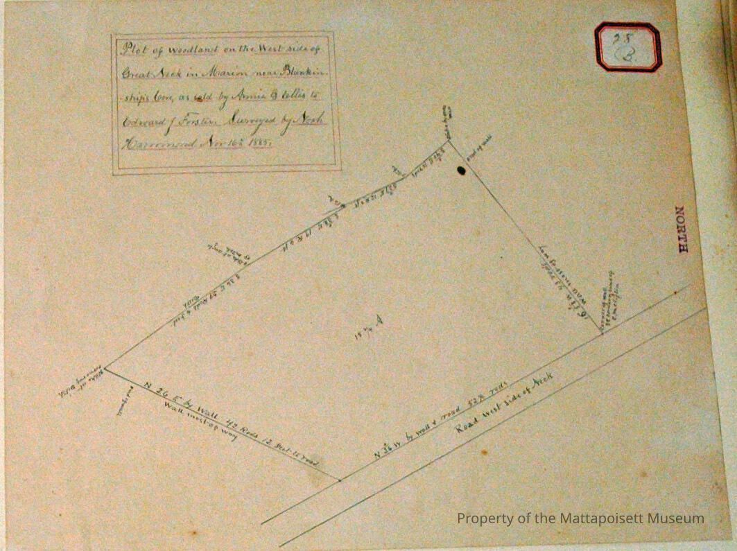 Plot of woodland on the west side of Great Neck in Marion near Blankinship Cove as sold by Annie G Ellis to Dr. Edward J. Forster. Surveyed by Noah Hammond November 16th, 1885.Acquisition