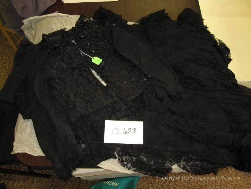 Notes: Notecard: Black lace over silk jacket. Heavy jet trim, black satin bow at neck and in back. Skirt of same black lace over silk taffeta with calamenco lining.