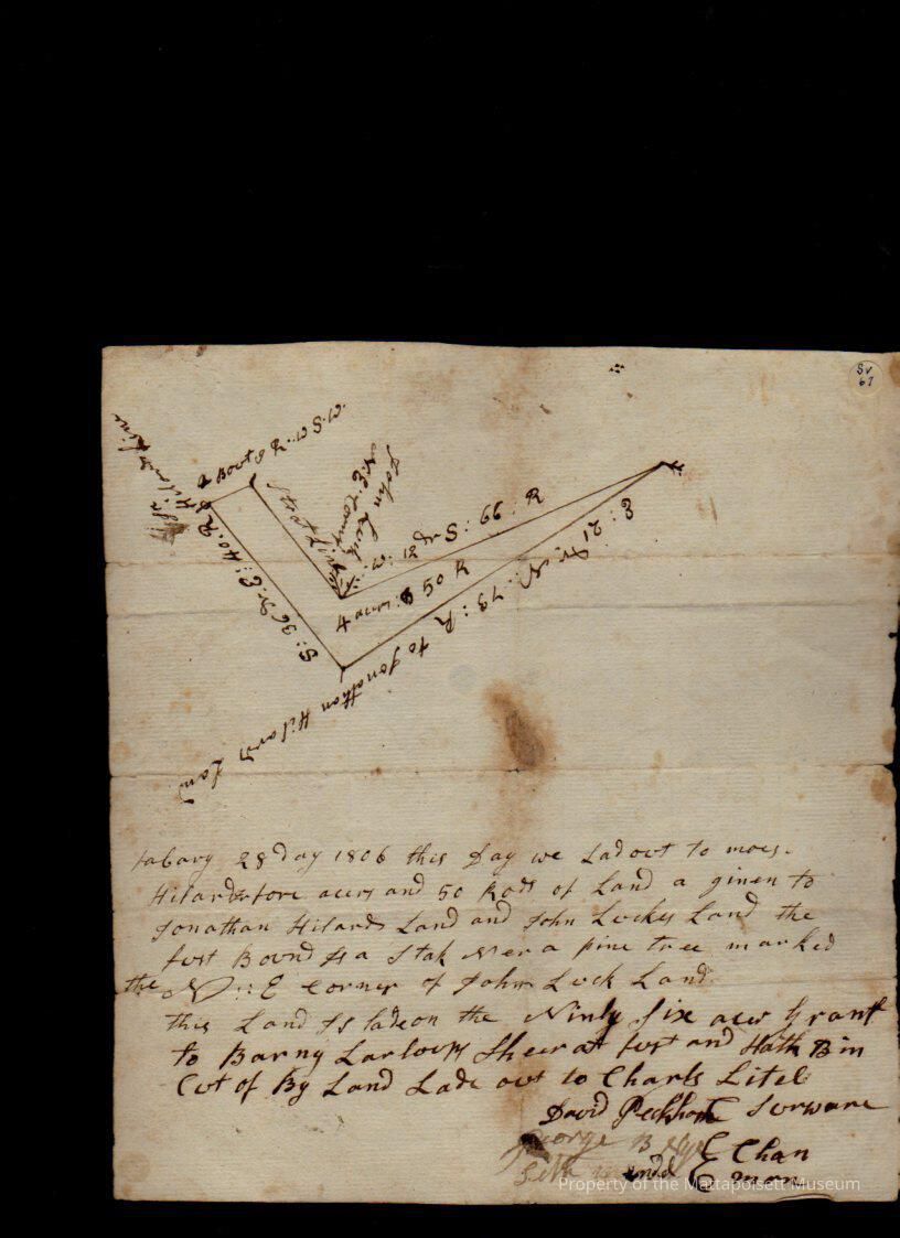Plan of land containing 4 acres and 50 rods given to Jonathan Hilard and John Lockes (Moses Hiller land). David Peckham, surveyor.Collection