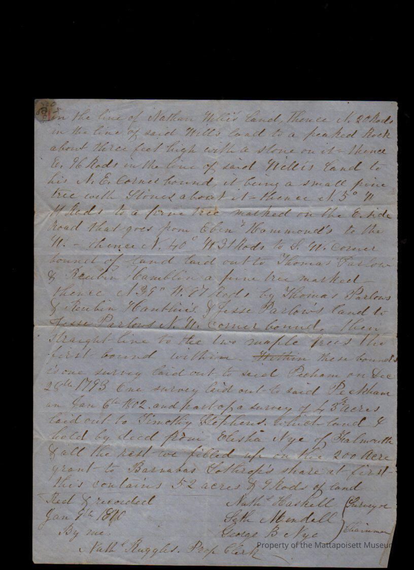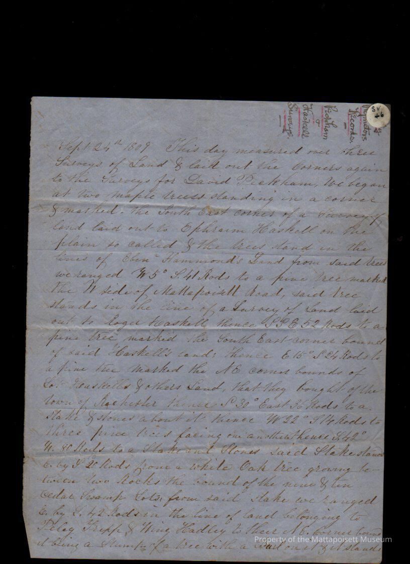 Description of remeasurement and resurveying of land and laid out corners to the surveys for David Peckham. Peckham and Haskell, survevyors.Collection