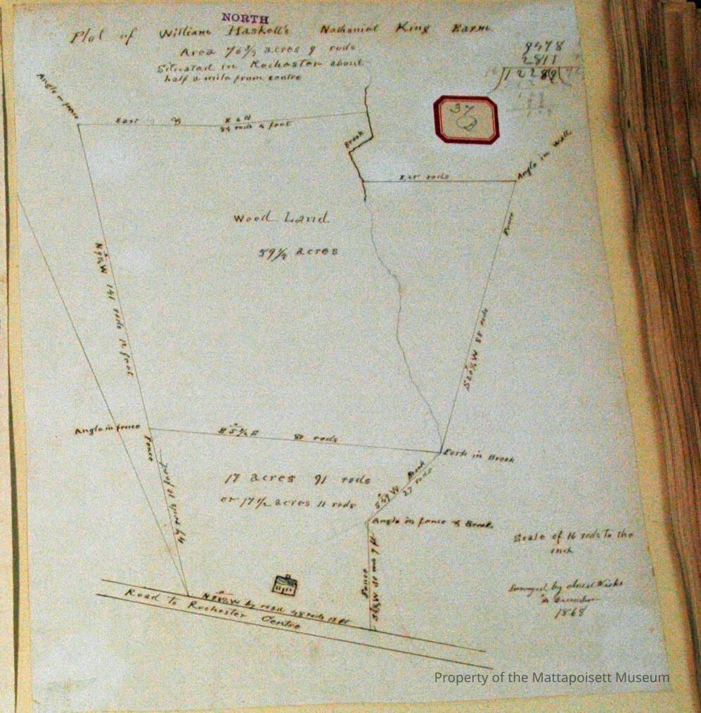 Plot of William Haskell's Nathaniel King Farm. Area 76 3/4 acres, 9 rods. Situated in Rochester about half a mile from center. Scale 16 rods to 1 inch. Surveyed by Ansel Weeks, December 1868.Acquisition