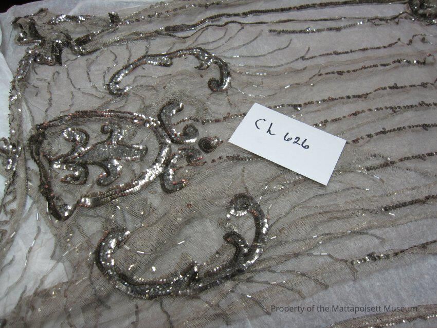Notes: Notecard: Gray shift "flapper". Heavy silver sequins. Net embroidered with crystal beads. Top section very frail.