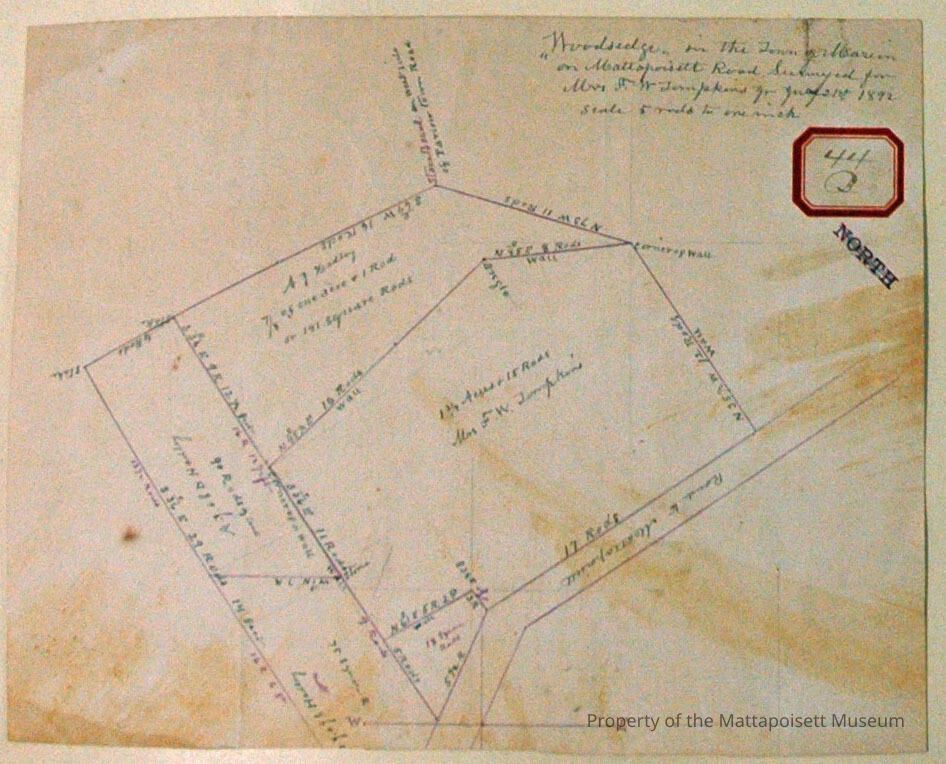 "Woodsedge" in the town of Marion on Mattapoisett Road. Surveyed for Mrs. F. W. Tompkins July 21st, 1892. Scale: 5 rods to one inch. Abutters: A. J. & S. D. Hadley.Acquisition